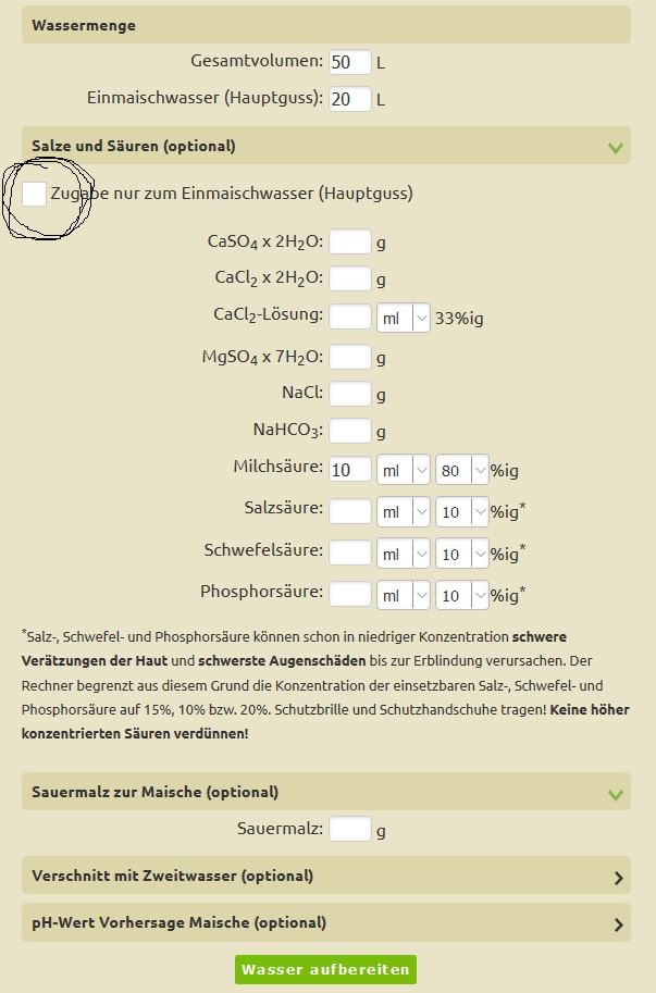 Ich könnte somit nur über den Wasserrechner von maischemalzundmehr mein Brauwasser mit der Zugabe von Sauermalz berechnen.
