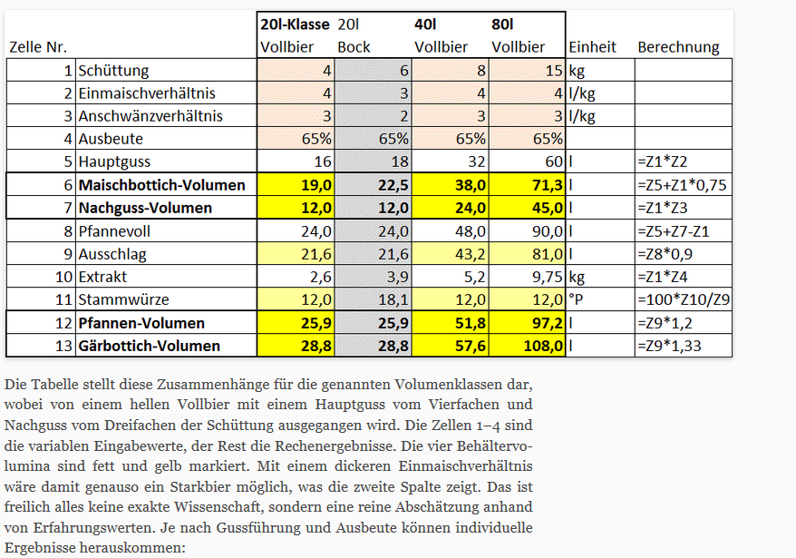 Wenn ich dann folgende Tabelle zur Hand nehme, merke ich zumindest, dass ich erst mal lieber auf 35 Liter reduzieren sollte, bis ich meine Anlage besser kenne, denn sonst bekomme ich vermutlich beim Läutern Schwierigkeiten.