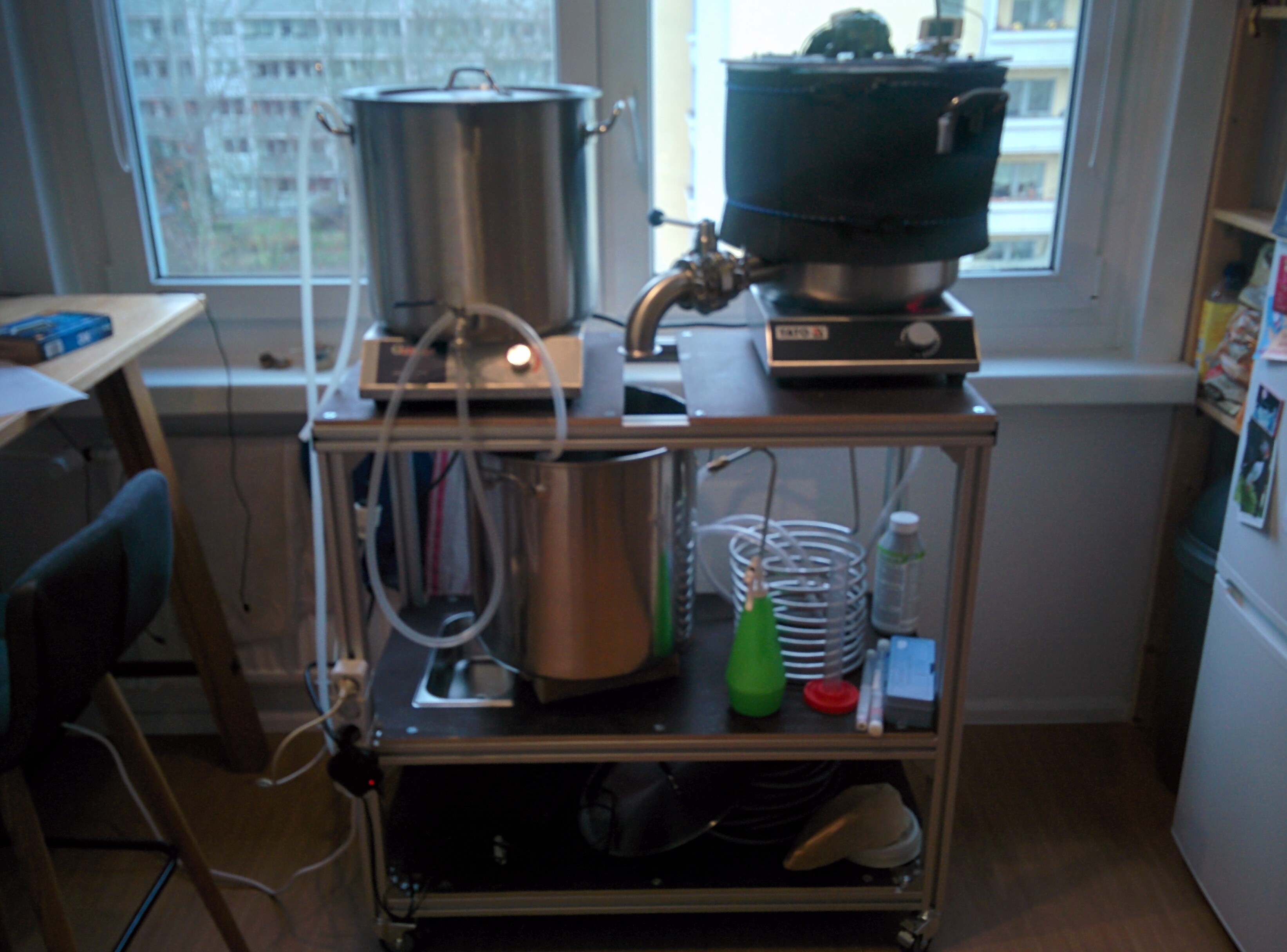 So sieht es nun aus: Ein Brewpaganda-Chef-37l Topf mit Tri-Clamp und Scheiben-Hahn als Maischekessel (unter der Dämmung). Es wird direkt abgemaischt und dann der Topf für den Nachguss genutzt. Das Rührwerk ist DIY, welches ich schon für meinen alten Einkocher nutzte. Passt glücklicherweise auch jetzt noch wie angegossen. Es ist ein alter Nissan-Scheibenwischermotor, altes Notebooknetzteil, ein wenig Lötzinn und ein kleiner Schalter sowie ein wenig Edelstahl aus dem Baumarkt für Rührer und Gewindestange. Das ganze steht auf einer YATO-3,5kW-Induktionsplatte. Wie im anderen Thread schon geschrieben, habe ich das total unterschätzt. Angebrannt und Termperaturen über das Ziel hinaus - määh!