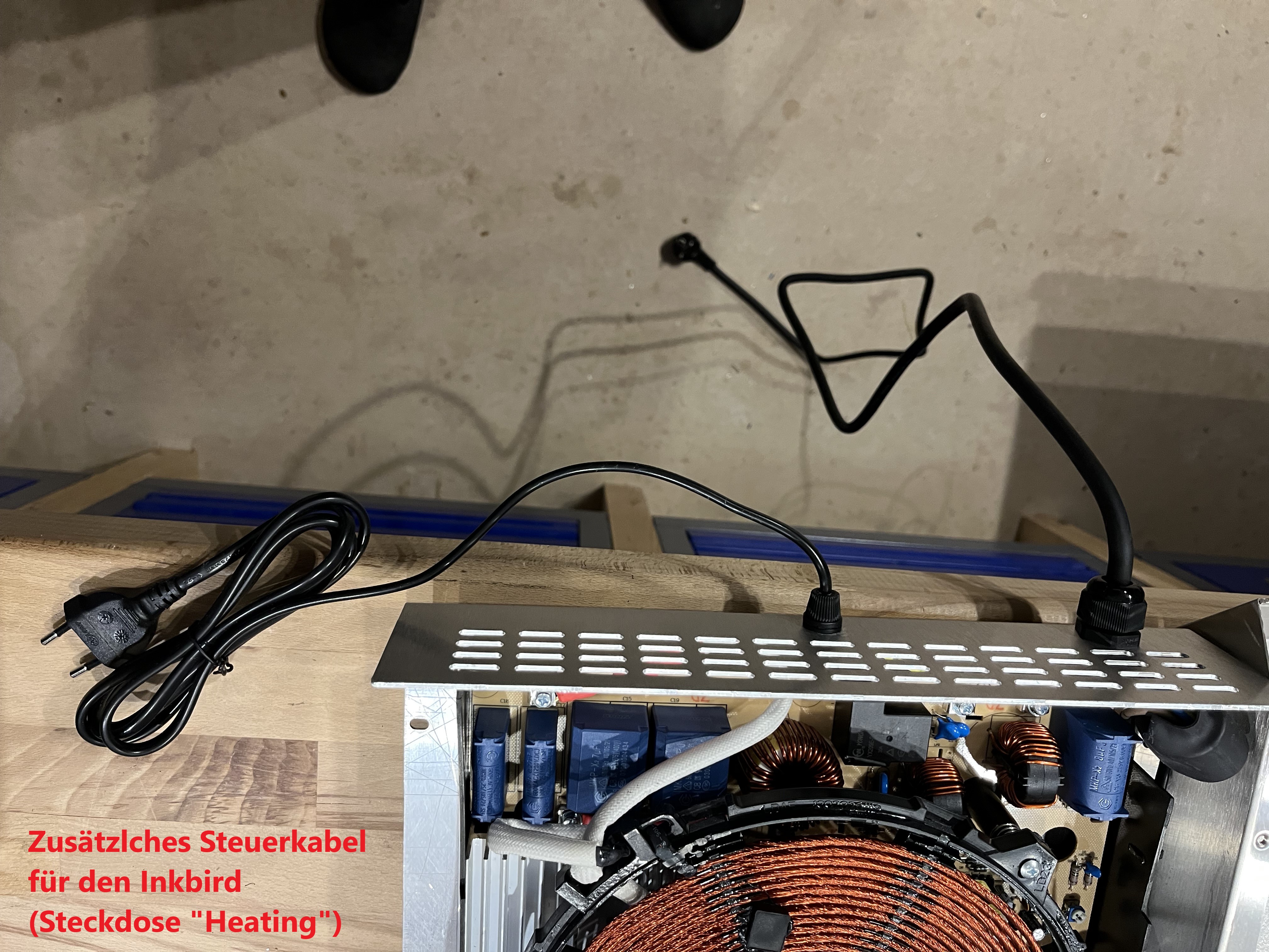 Wenn das zusätzlich eingebaute 230V-Steuerkabel entsprechend Netzspannung bekommt, dann kann die Induktionsplatte wie im Originalzustand auch ohne einen Inkbird über den Drehschalter gesteuert werden. Aus meiner Sicht ist das die einfachste und günstigste Lösung für eine leistungslose Steuerung und Automatisierung von Induktionsplatten mit Drehschalter.