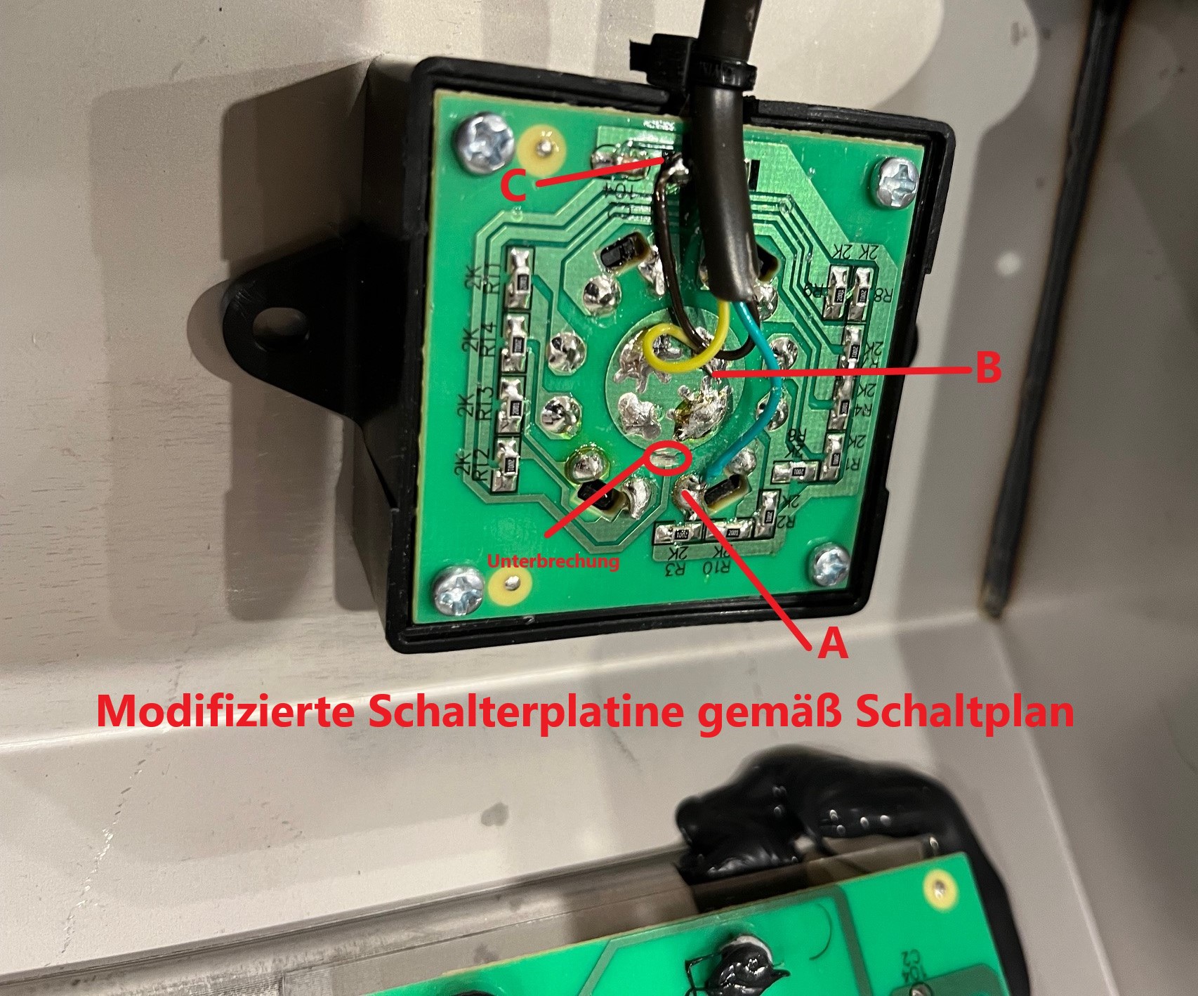 Es muss eine Leiterbahn aufgetrennt werden, z.B. mit der Klinge eines kleinen Schraubendrehers, das Bild sollte eigentlich alles erklären.