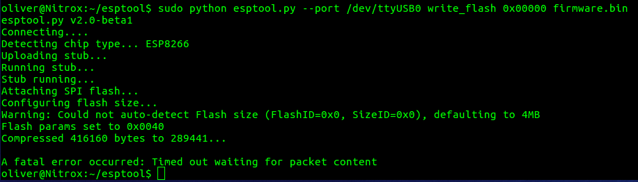 Gefunden wird der ESP- Dann fängt's an, komisch zu werden: could not auto-detect flash size und zum Schluß ein TimeOut?