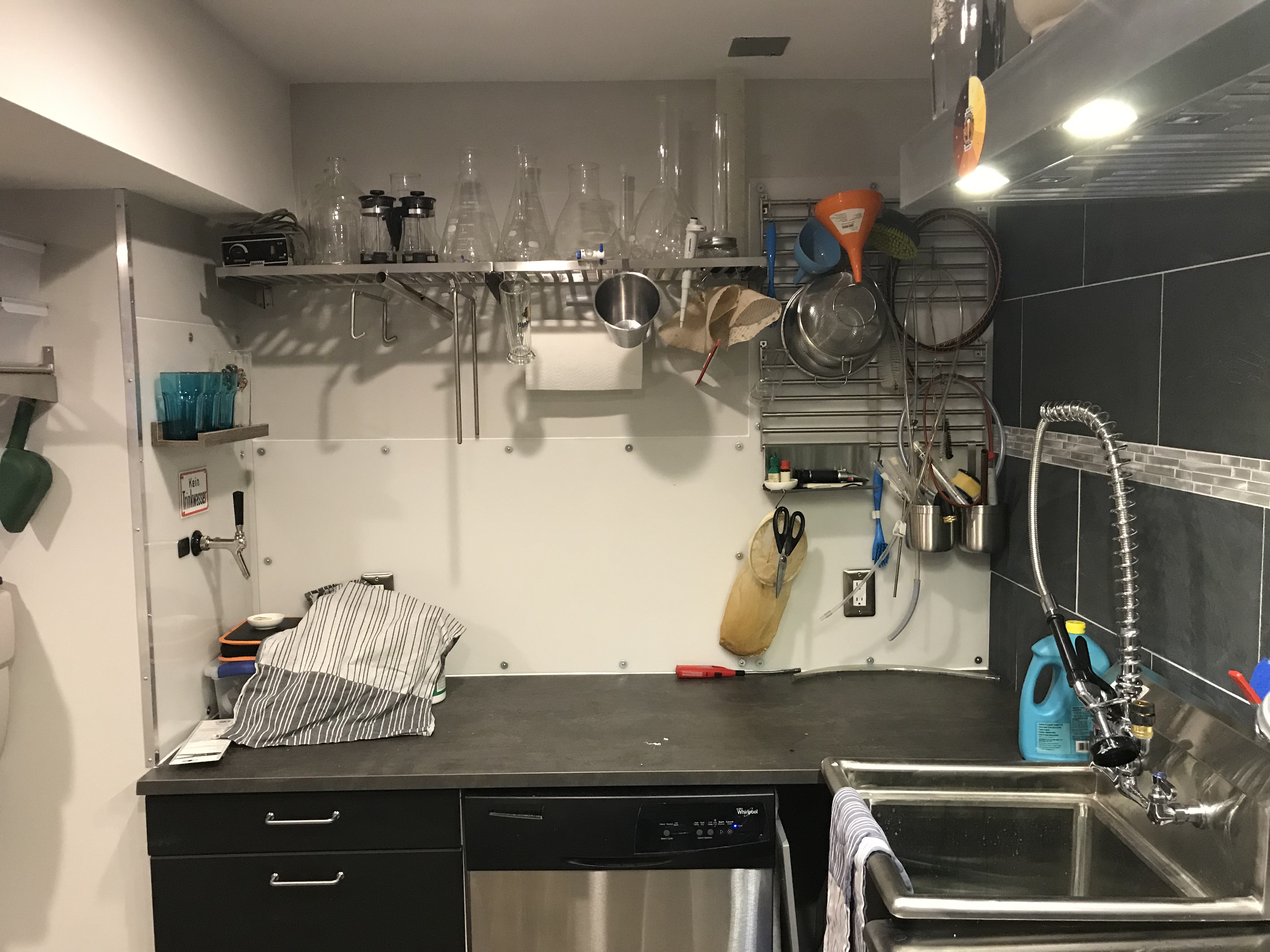 Jetzt ist die Wandverkleidung fertig. Sonntag nochmal eine IKEA Tour um 3 Edelstahl Boards zu kaufen. Fehlt noch die Verkleidung für die Mühle, das Holz ist angefragt (ich vermiss einen Baumarkt der mit der Plattensäge auch umgehen kann :crying ). Die Kühlschränke noch in ihre Nische und langsam kann ich an den ersten Sud denken :thumbup