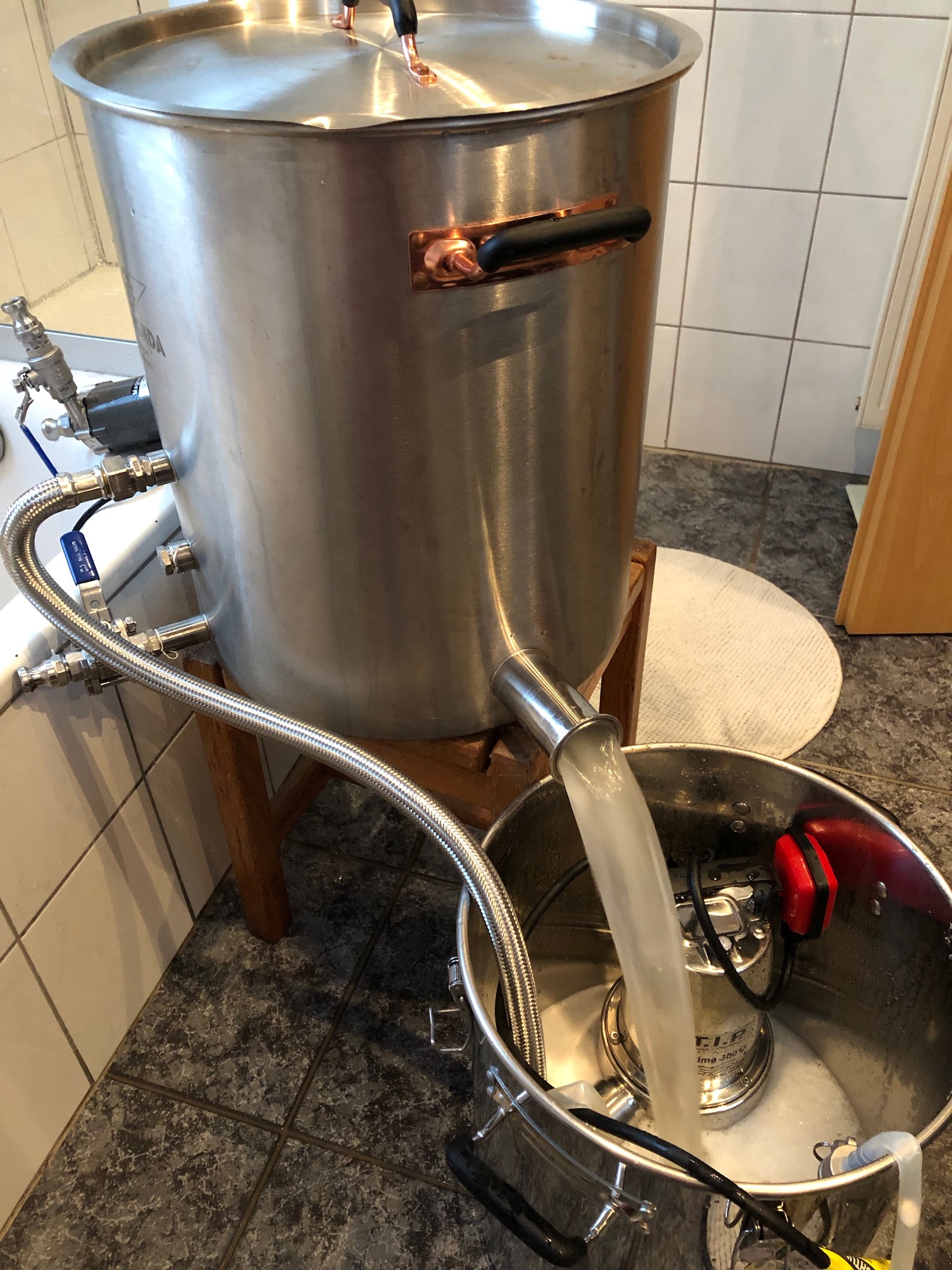 Die Pumpe, mit der ich auch den Chronical reinige steht einfach im Läuterbottich. Durch den 2" Hahn des Braukessels läuft das Wasser direkt wieder runter. Der Strahl spült auch gleich den Decken von unten mit