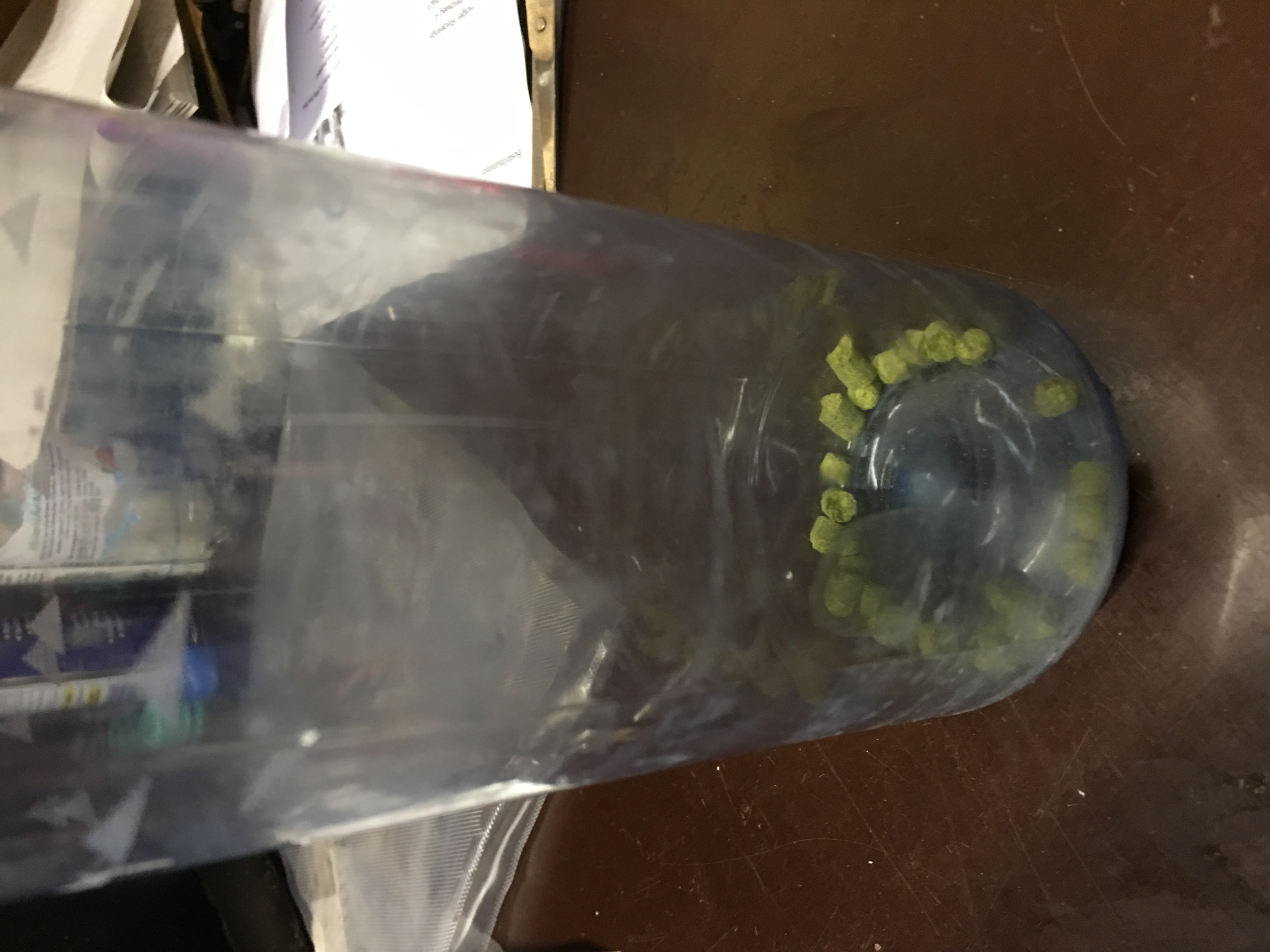 Die Hopfenpellets, so der Plan bleiben dann eine gewisse Zeit unter stark CO2 haltiger Atmosphäre in der Flasche, bevor ich sie aus der Flasche heraus in den Gäreimer schütte.