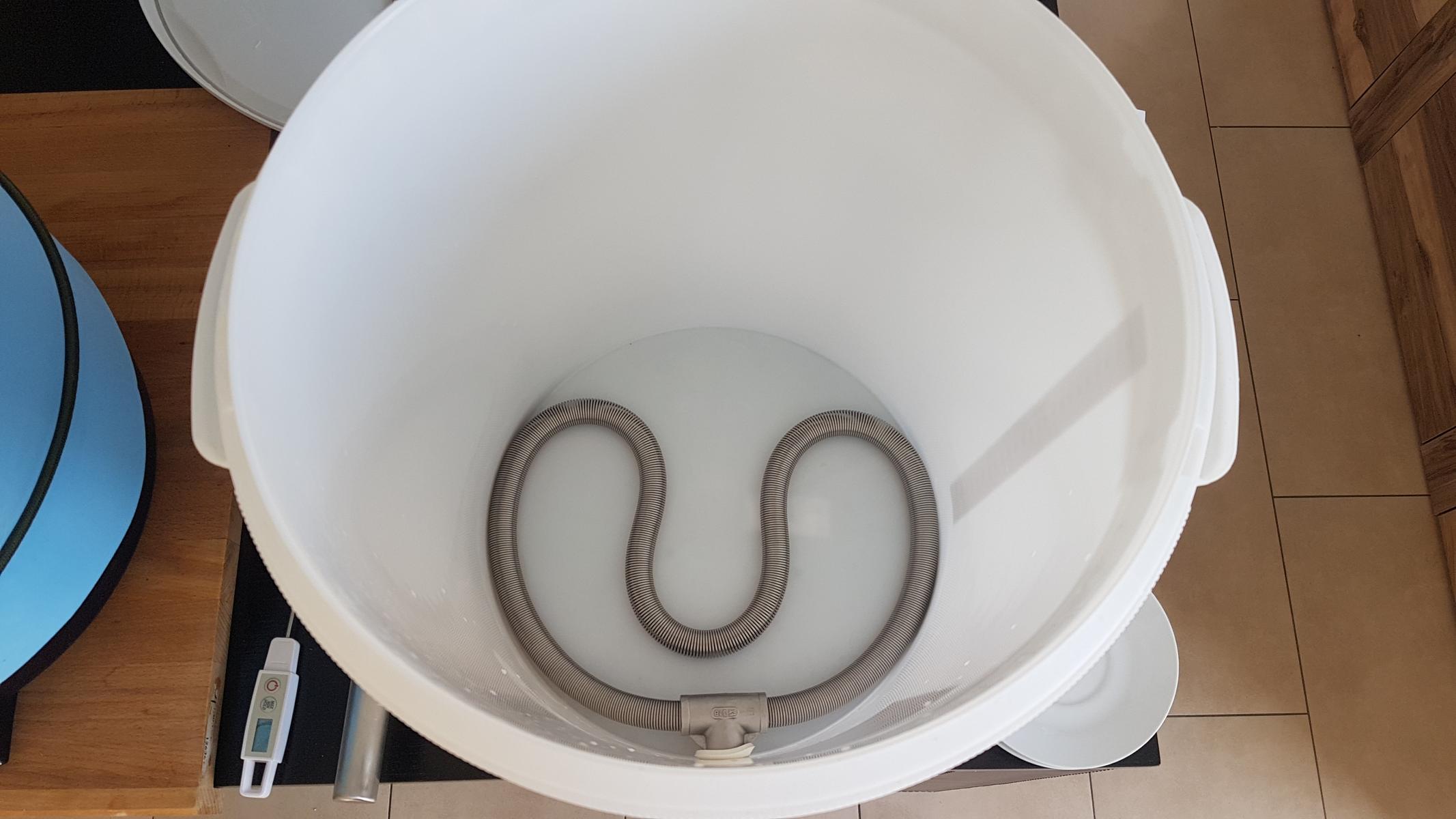 Ebenfalls eine neue Errungenschaft meine Spirale. Ich war ganz verblüfft wie schnell sich damit die Würze auf 24 Grad Celsius abkühlen lies. Und das bei ca. 60 Liter "Wasserverbrauch" welches ich aber aufgefangen habe und als Gießwasser verwenden werde.