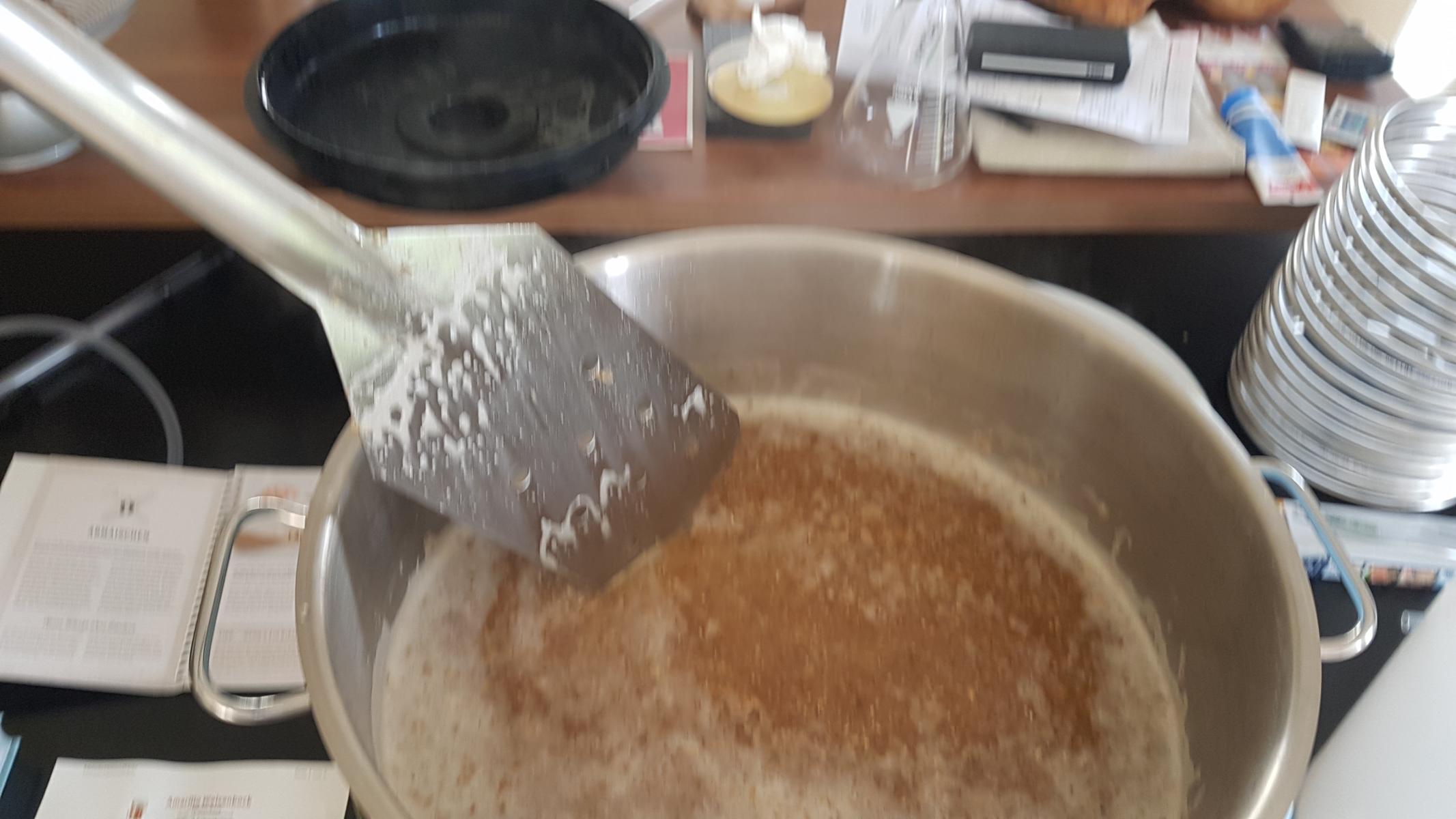 Das Läutern hat diesmal deutlich länger gedauert als beim Klosterbier. Ich nehme an, das liegt an dem recht hohen Anteil Weizen. Vielleicht habe ich aber auch etwas zu fein gemahlen. Die Läuterung dauerte jedenfalls gut 1 Stunde.
