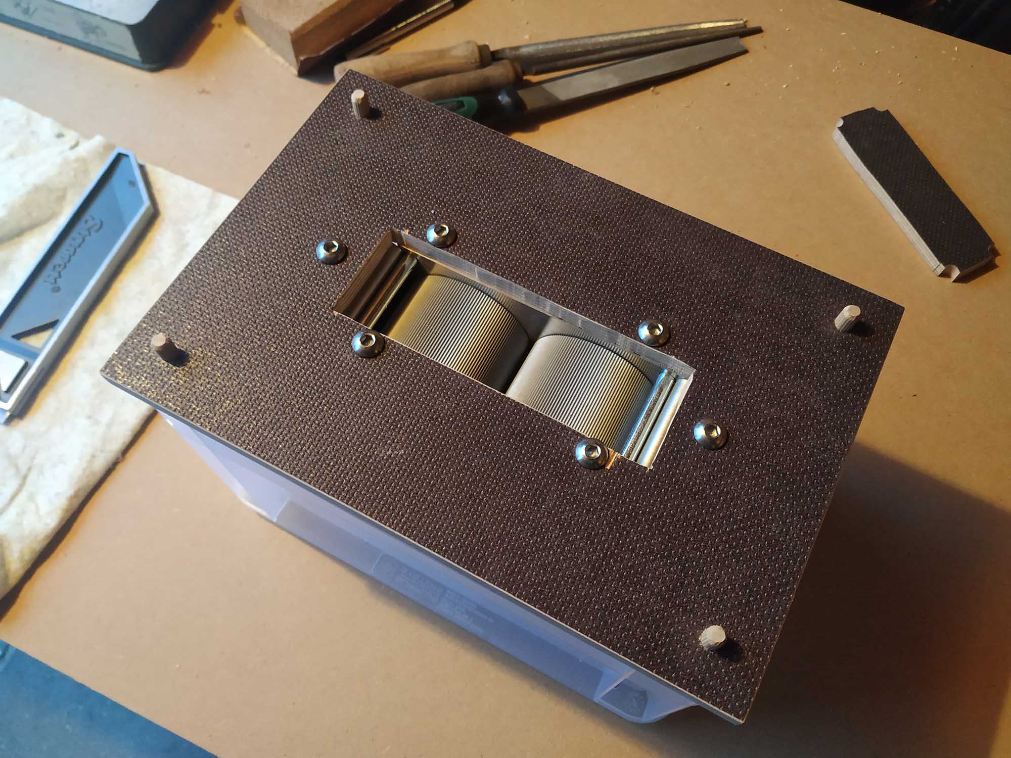So schaut es bei mir aus: MattMill Kompakt mit sehr kleiner Box, aber genau passend für 2,6 Kg Malz (Braumeister 10). Und die Platte lässt sich samt Trichter-Adapter auf links drehen und hängt dann kopfüber in der Box. Was bei mir leider sehr schlecht geklappt hat ist das Aussägen der Aussparung...hier ist alles ausgefranst ohne Ende (sieht auf dem Foto weniger schlimm aus als es ist).