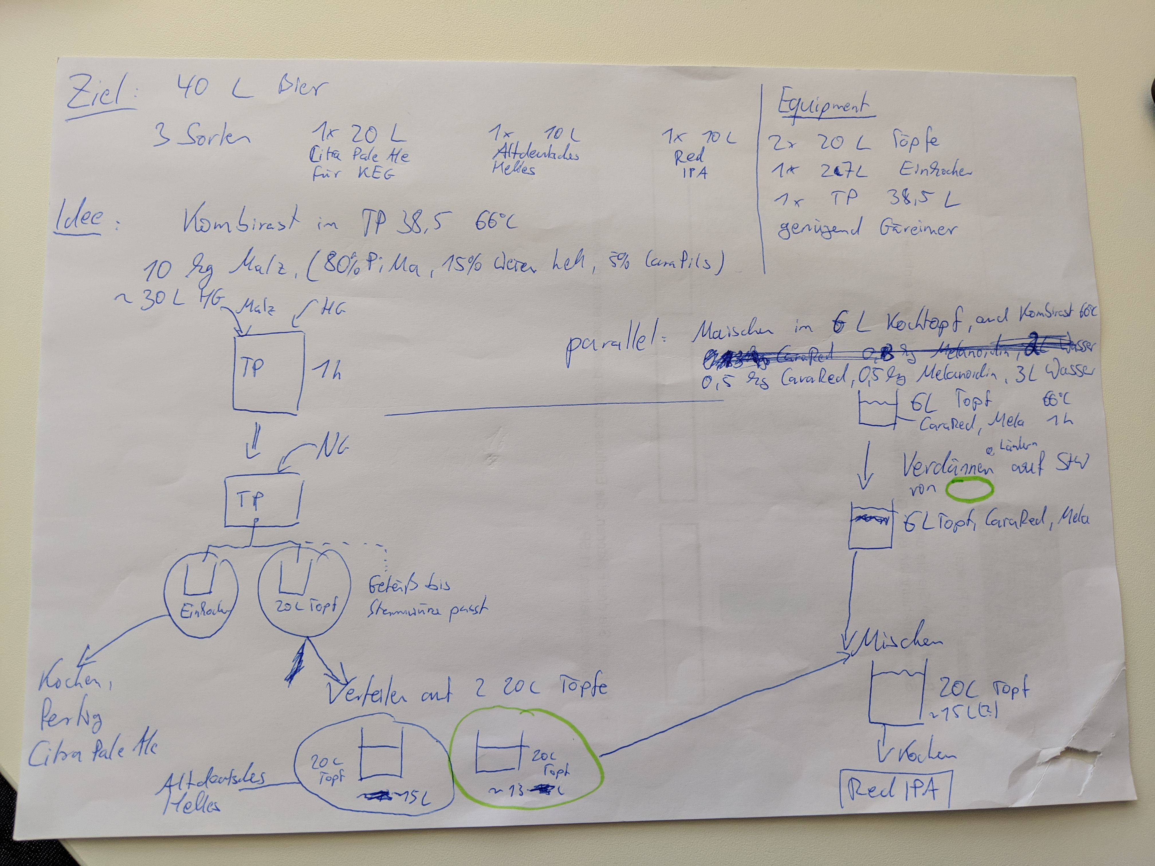 Da ich zwei Töpfe zum Kochen habe, sehe ich hier noch kein Problem. Ich werde einfach eine Kombirast und eine Schüttung hellen Malzen machen und dann mit unterschiedlichen Hopfen und Hefen arbeiten, um die Geschmäcker zu treffen.