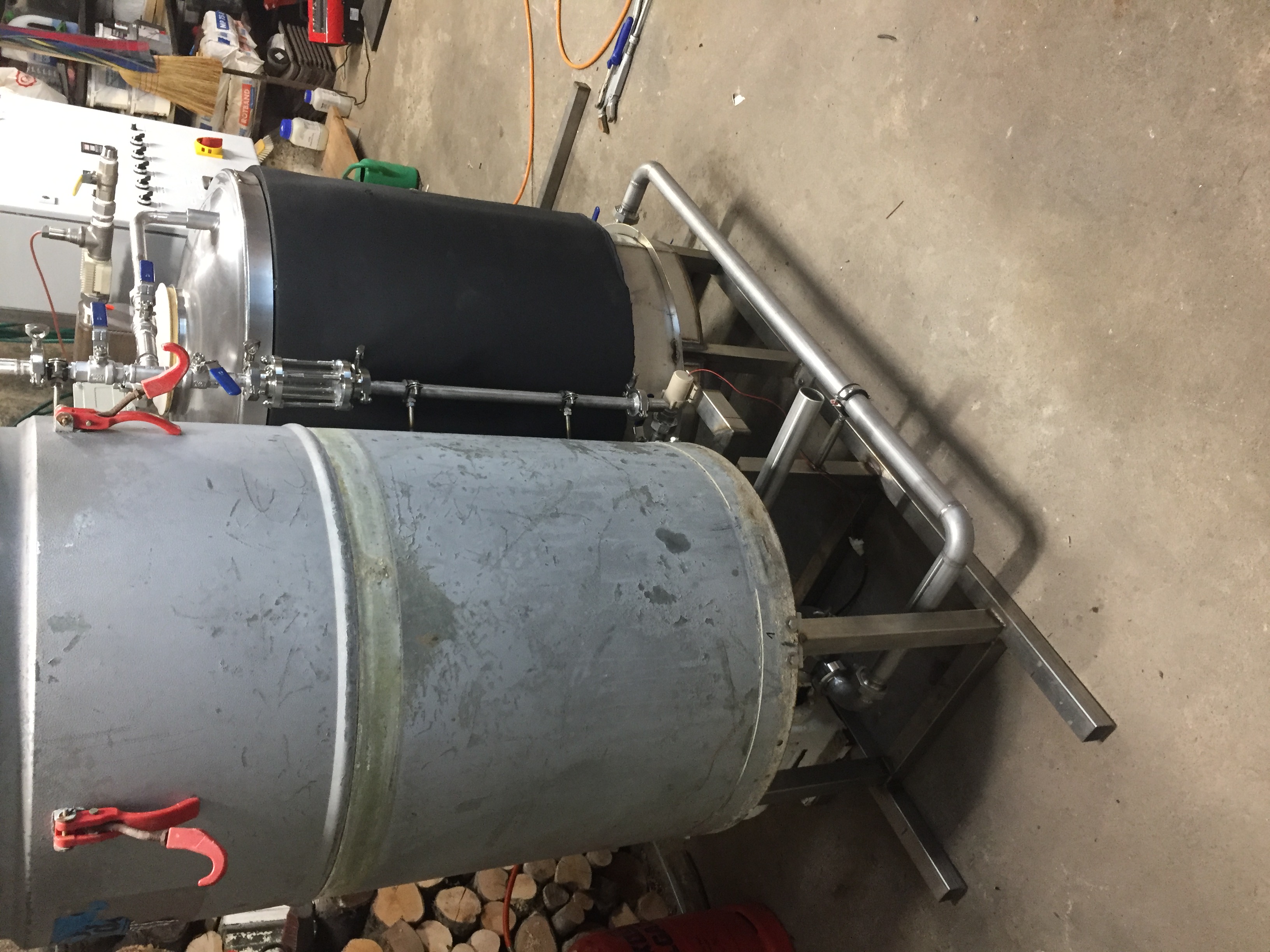 Geplant und gebaut wird ein 2 Geräte Sudhaus. Die Maische/Würzepfanne ist ein 275 Liter Behälter (Eigenbau). Läuterbottich ist ein alter 260 Liter Milchtank.