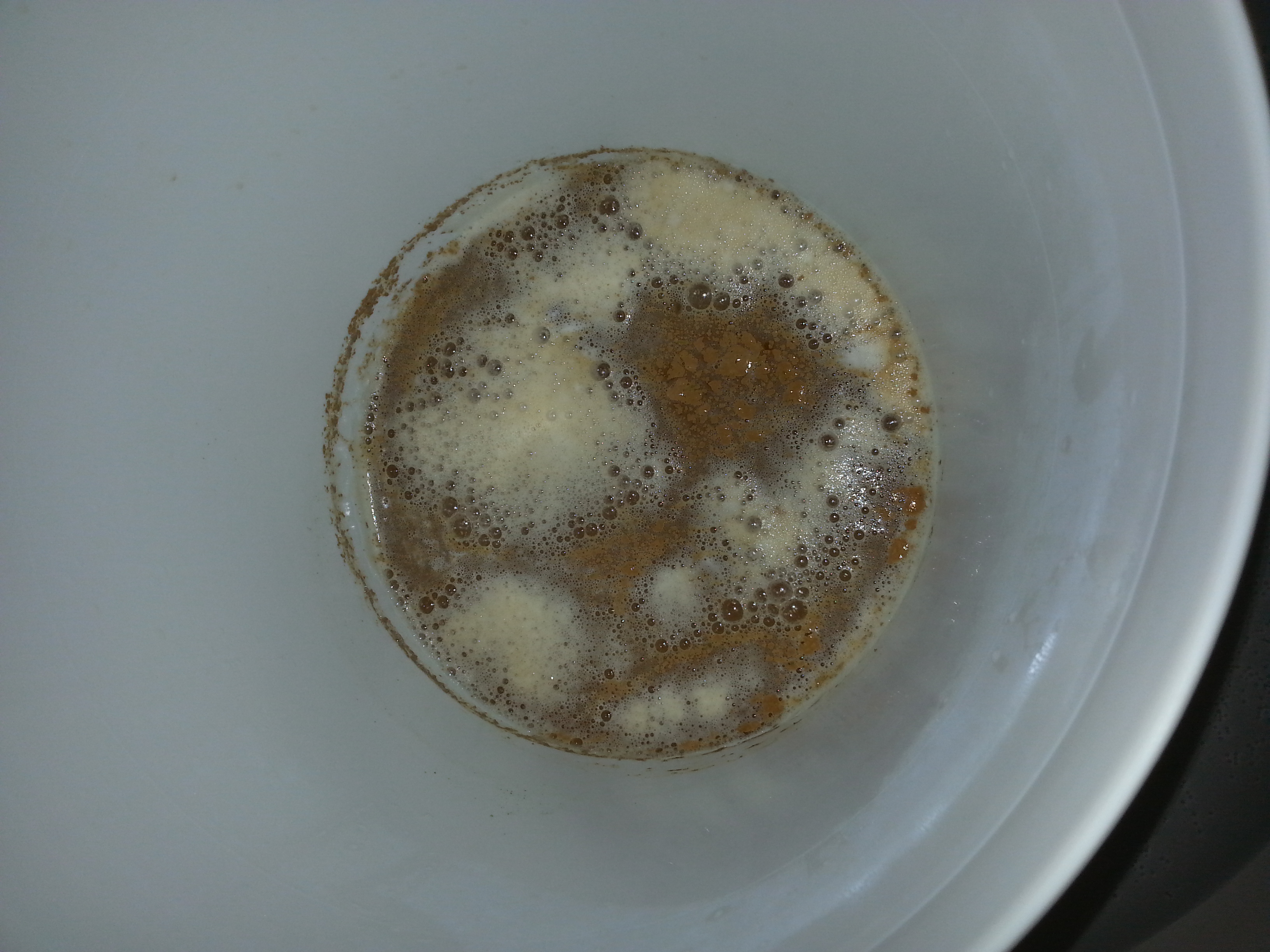 - rehydrierte Trockenhefe untergärig Brewferm in den Topf, 1 min mit schneebesen durchgerührt...seeehr viel Schaum, Konsistenz: Guinness-Like :thumbup