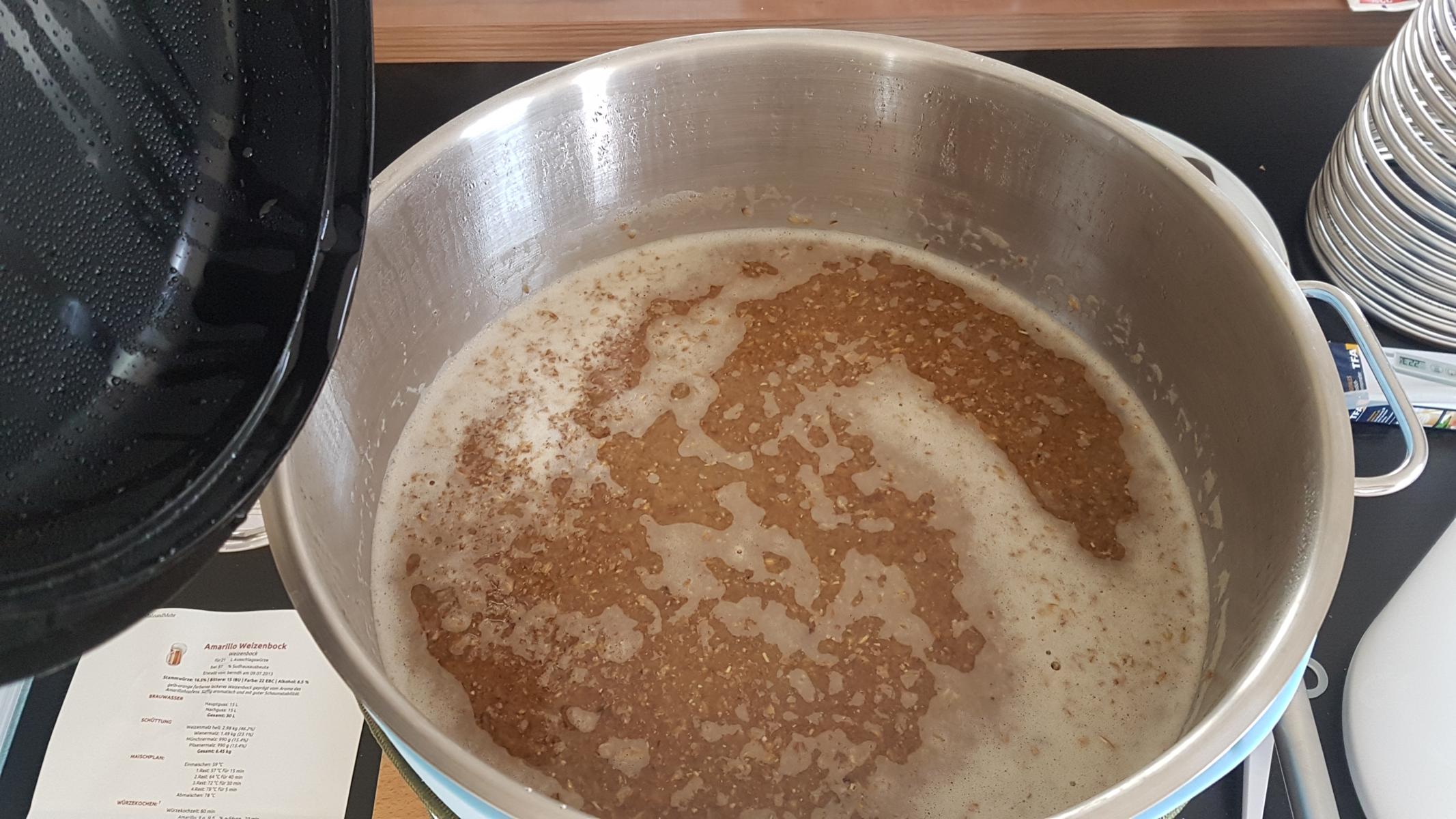 Das Läutern hat diesmal deutlich länger gedauert als beim Klosterbier. Ich nehme an, das liegt an dem recht hohen Anteil Weizen. Vielleicht habe ich aber auch etwas zu fein gemahlen. Die Läuterung dauerte jedenfalls gut 1 Stunde.