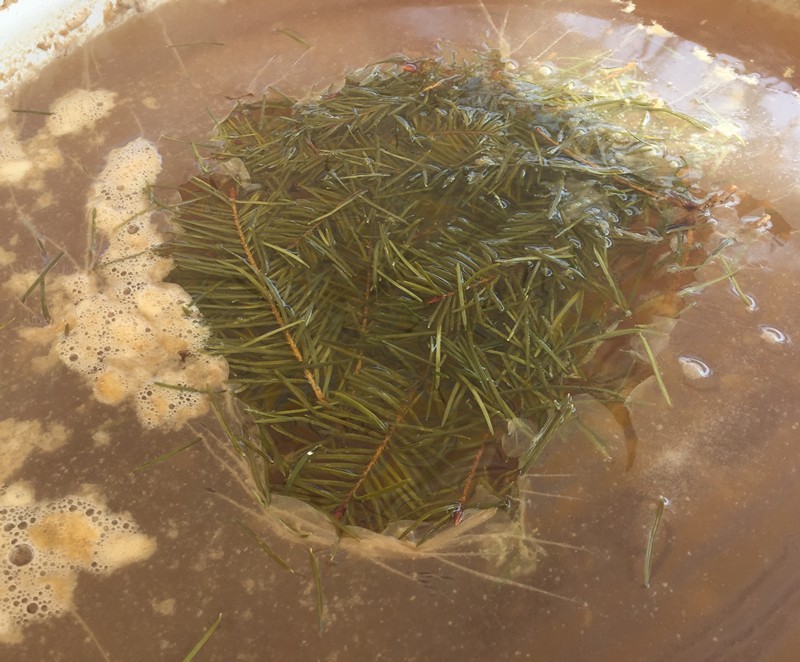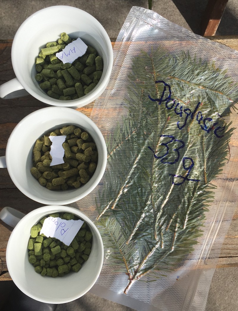 Zutatenzusammenfassung: reine Pilsner Malz Schüttung, statt Perle als VWH des Originalrezeptes hab ich Mount Hood genommen, Hallertauer MF bei flame out, Irish Moss und als meine Interpretation die Douglasiensprießer. Polaris kommt später noch zum Stopfen ins Spiel.