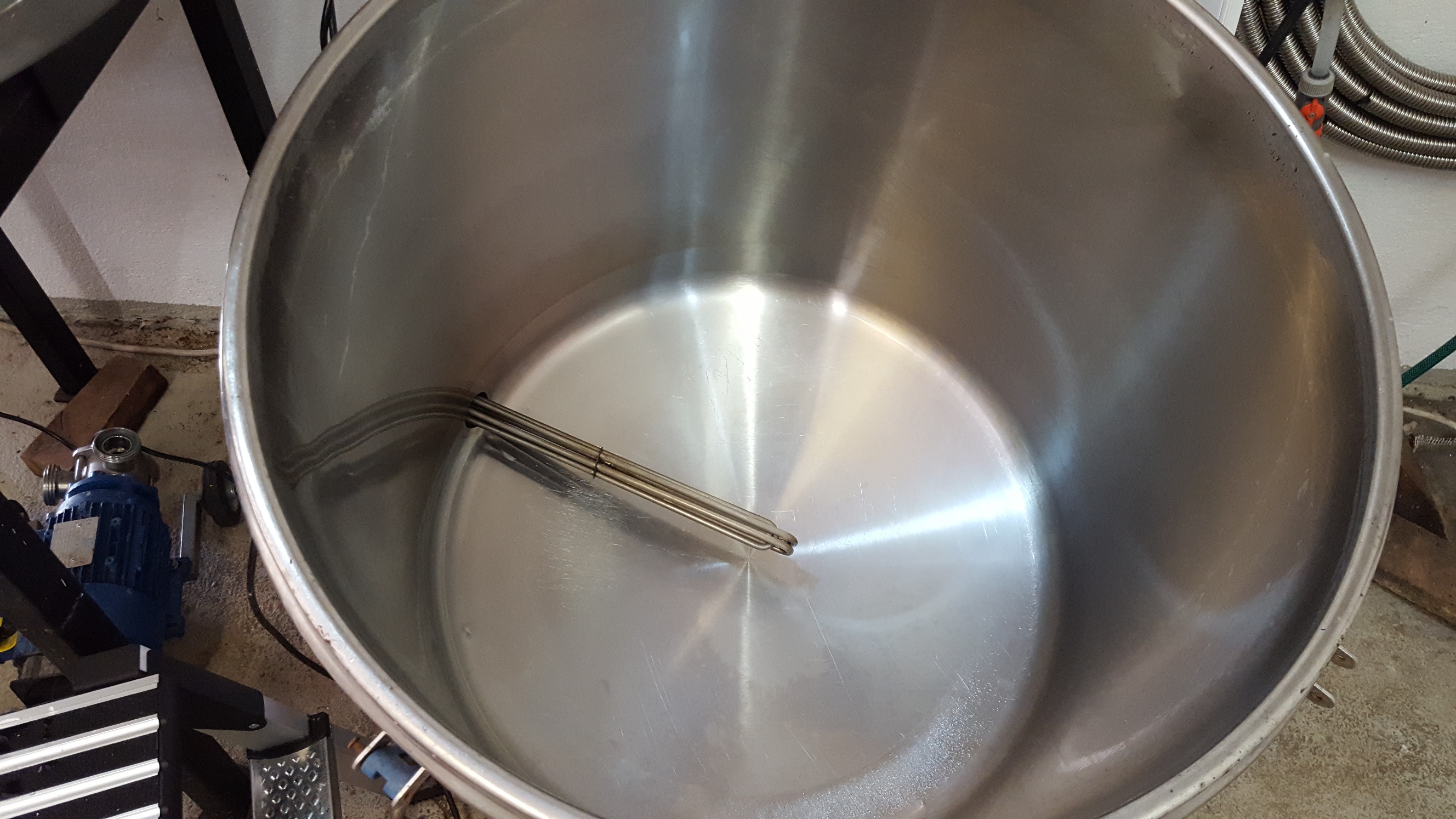 Der Boiler wird mit 60°C Wasser befüllt und muss dann halt noch raufheizen bis 75°C. Befüllt wird der Boiler nach dem Einmaischen. Die Zeit zum Aufheizen reicht aus bis das Wasser benötigt wird. Abgekühlt wird direkt in das Gärfass: Der Durchfluss und damit die Temperatur kann mit der Impellerpumpe und FU sehr gut eingestellt werden (Fremdlüfter an der Pumpe wegen sehr geringer Drehzahlen von etwa 3Hz).