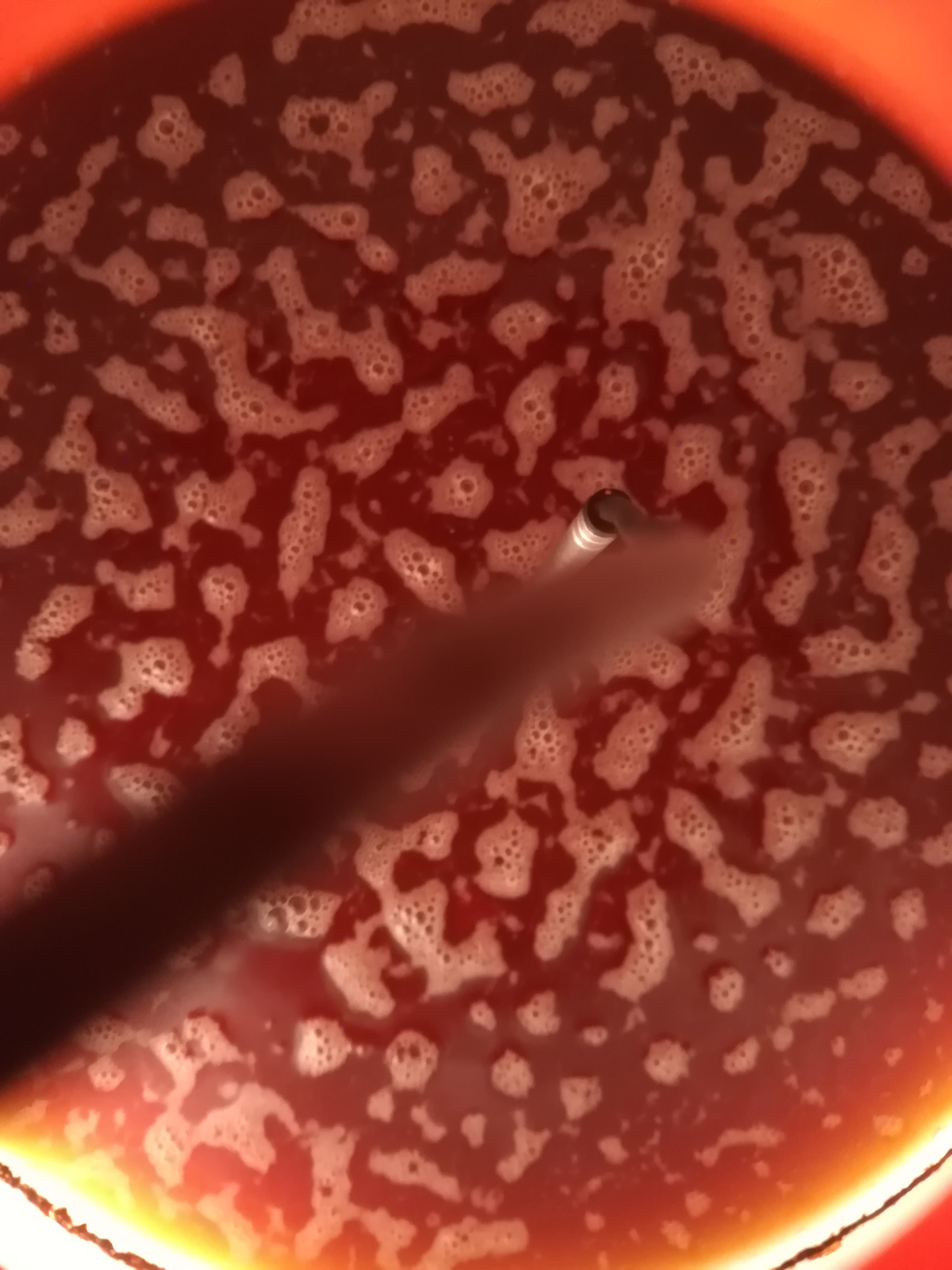 40 Liter Münchner Dunkel mit W34/78 aus Dritter Führung. Das Ganze als Dekoktion und single hop mit Diamant. Der Großteil der Gärung ist schon durch. Eine gute Woche bleibt es aber noch stehen.
