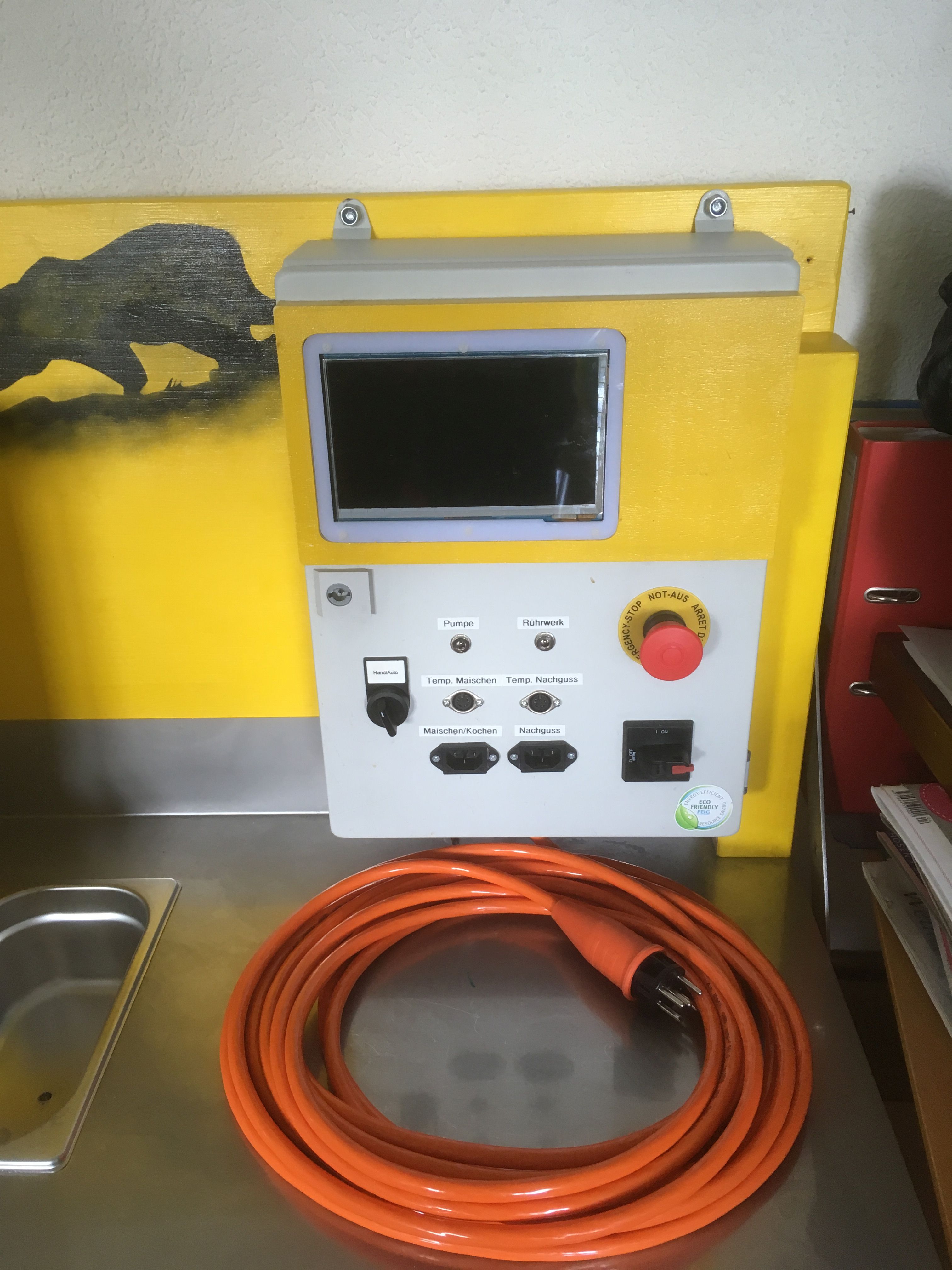 Ich braue seit etwa 2 Jahren Bier auf meiner selbstgebauten 30 Liter Anlage: Die Brausteuerung mit dem Schaltschrank ist auch selbst gebaut mit einem Raspberry und Tinkerforge Elemente. Darauf ein Touchscreen wo meine selbst programmierte Brausteuerung läuft.