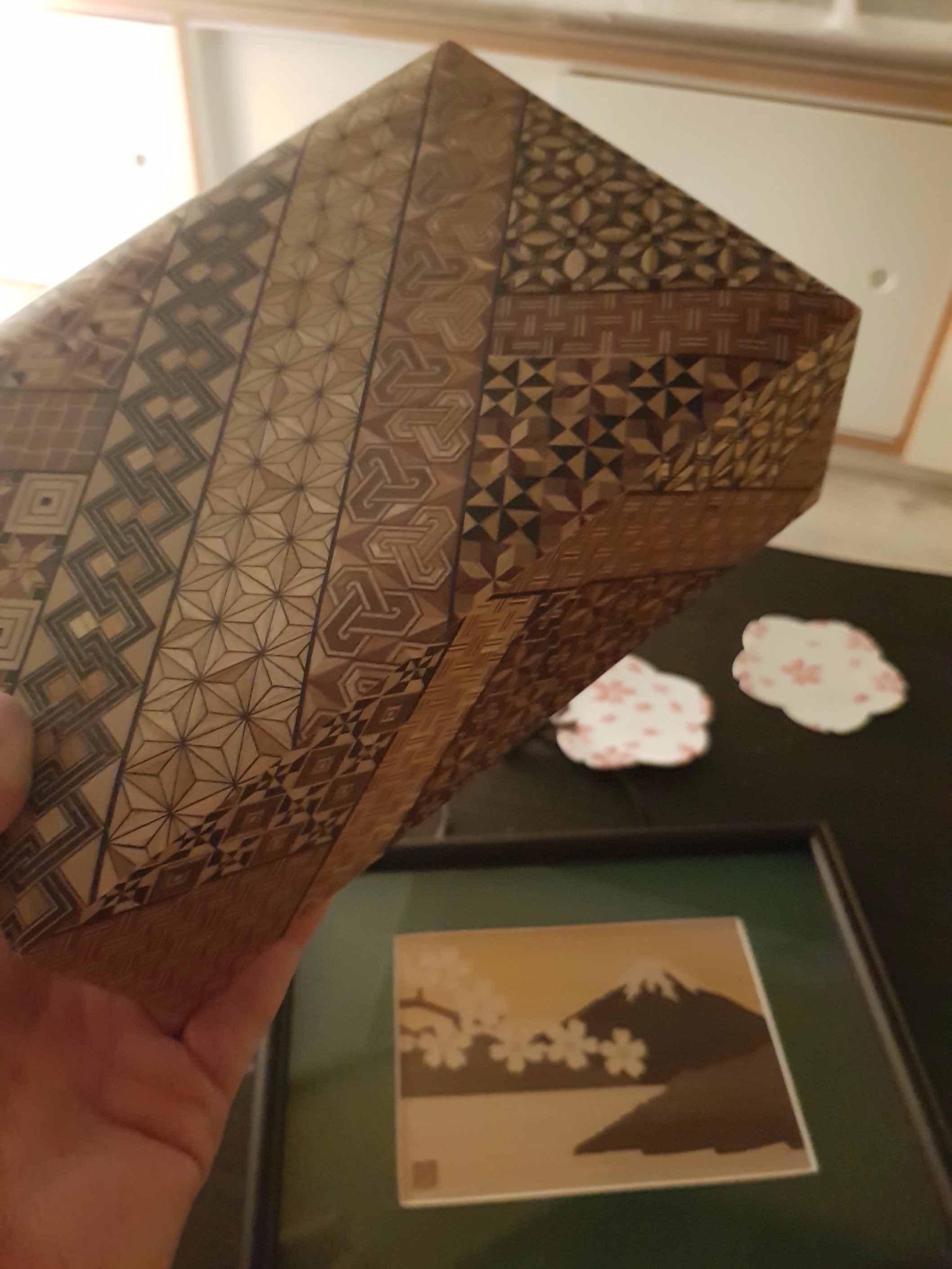 Falls es dich interessiert, das Bild habe ich aus Hakone, einer Kleinstadt die für ihr Holz-Kunsthandwerk bekannt ist (Hakone yosegi zaiku 箱根寄木細工). Die machen super schöne Ornamente mit verschieden-farbenen Hölzern, da habe ich beim letzten mal ein paar Schatullen und eben dieses kleine Bild mitgenommen. Die richtig großen Bilder aus vielen Hölzern sind leider nicht bezahlbar