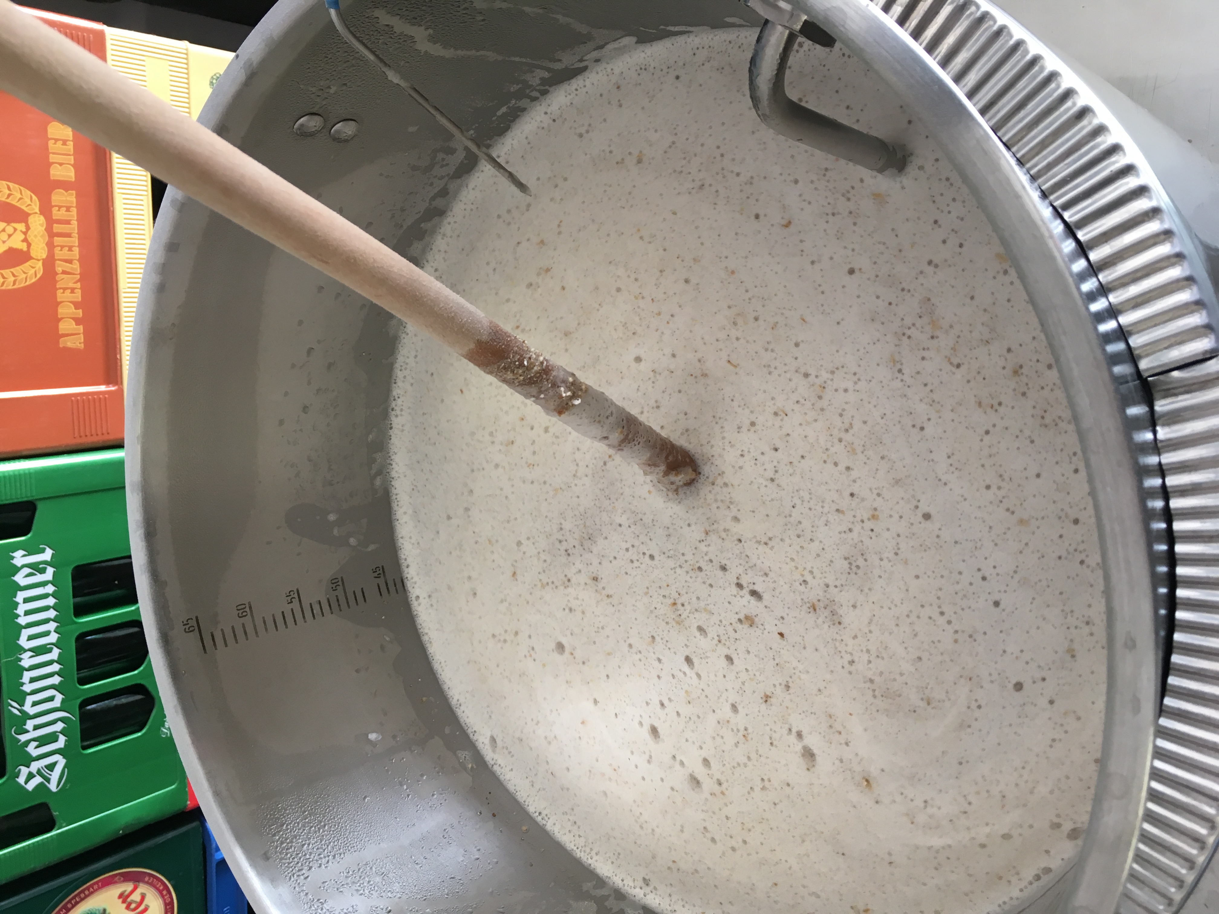 Es empfiehlt sich auf jeden Fall, nach dem Umschöpfen die Maische jedes mal wieder gut durchzurühren, damit es eine gute Durchmischung gibt und nicht der Mehlbrei im unteren Bereich alles dicht macht.
