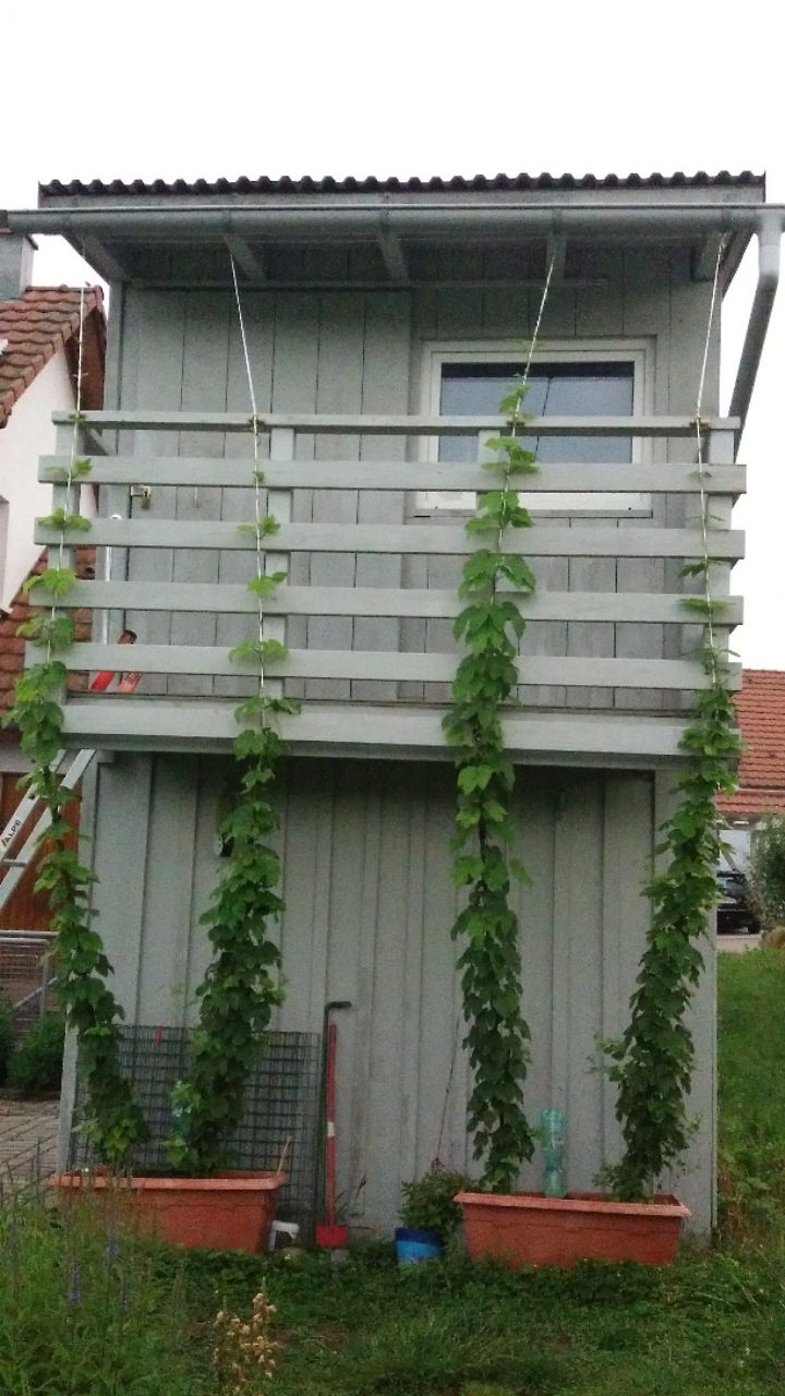 Hallo. Bin dieses Jahr neu im Hopfenanbau.... Habe leider nicht solche beeindruckenden Anlagen wie Ihr. Deshalb am "Baumhaus" angebracht.