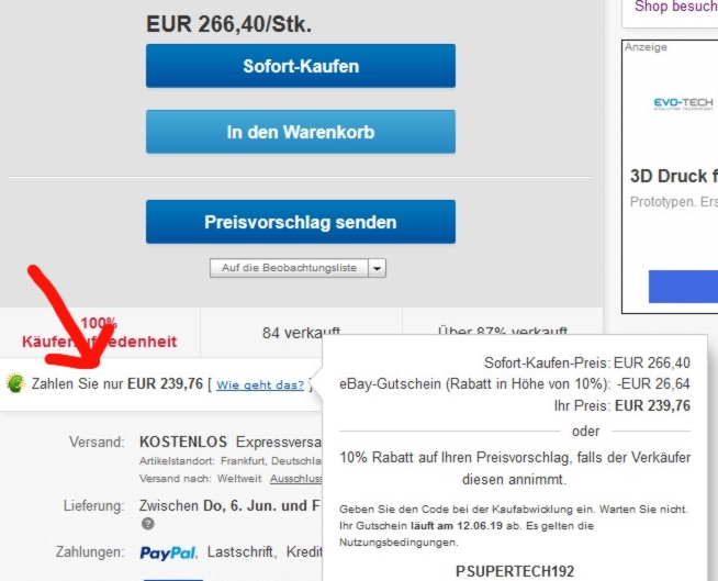 Ist das nicht der Fall, musst du dich zu einem Anbieter mit einem solchen Gutschein durchklicken, eventuell mit einem anderen Browser. Der Gutschein gilt auch für akzeptiere Preisvorschläge - 239,99 und 249,99 wurden abgelehnt, 259,99 wurden angenommen. Davon 10% runter sind dann 233,99. Du hast drei Anläufe frei, vielleicht klappt es auch mit 255€?