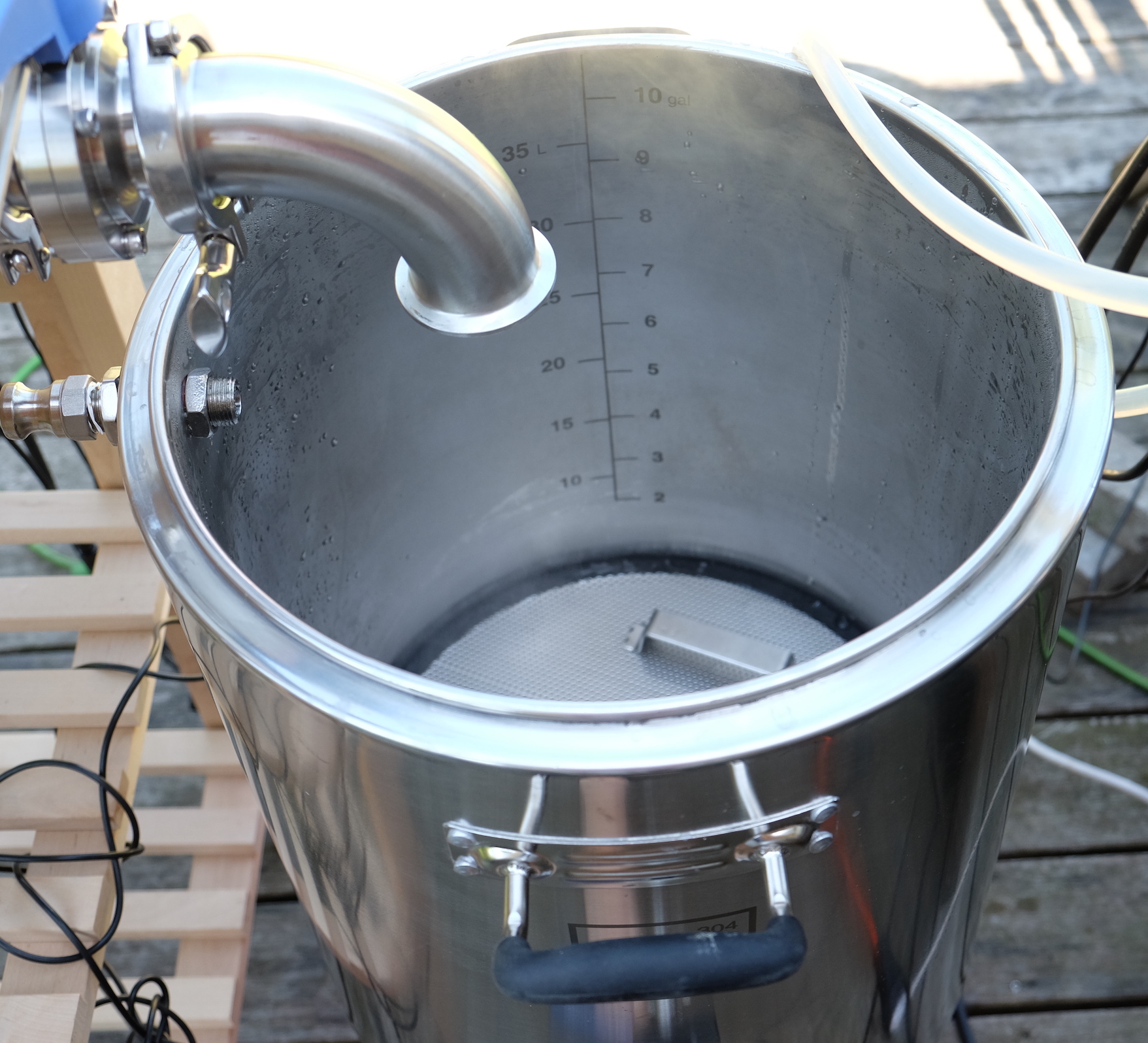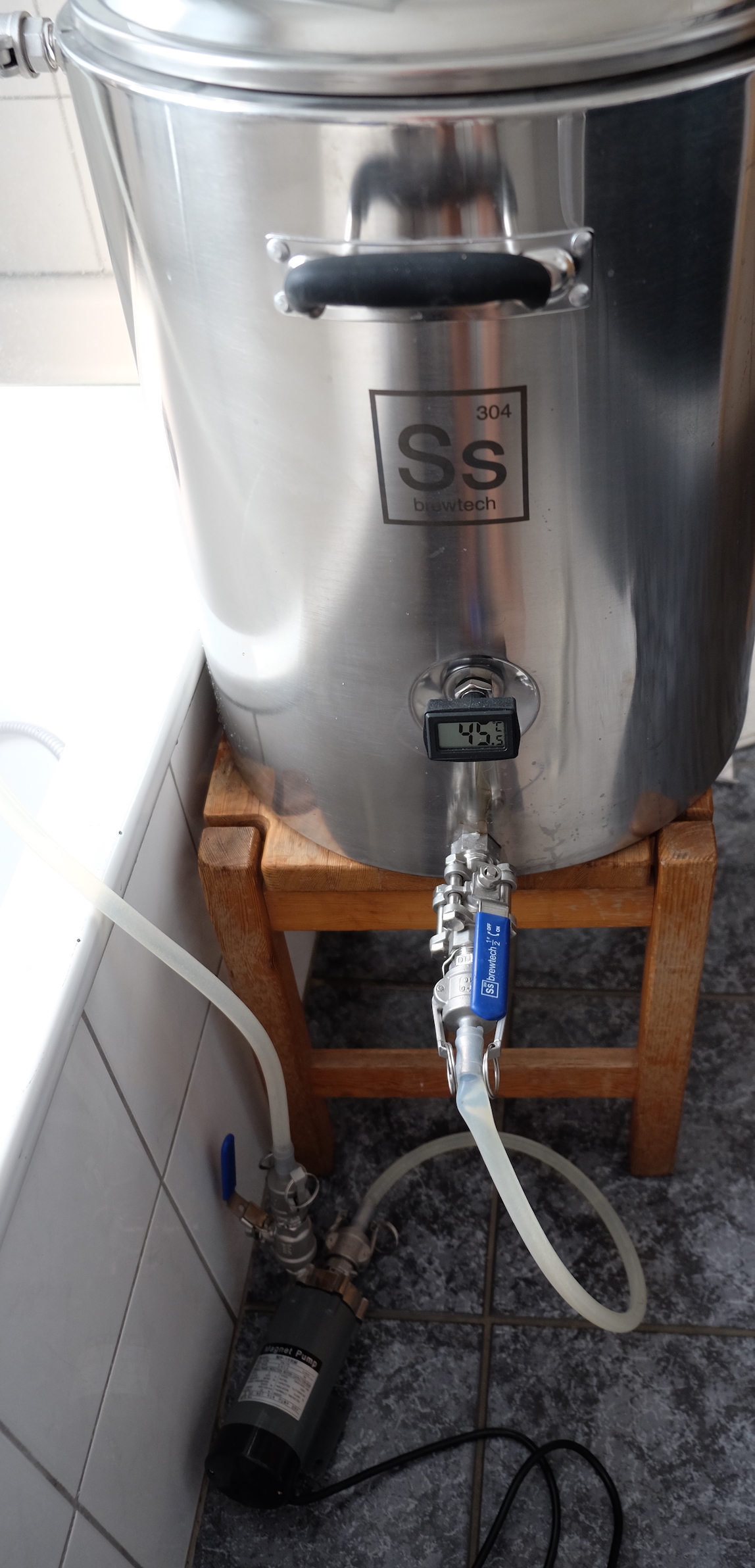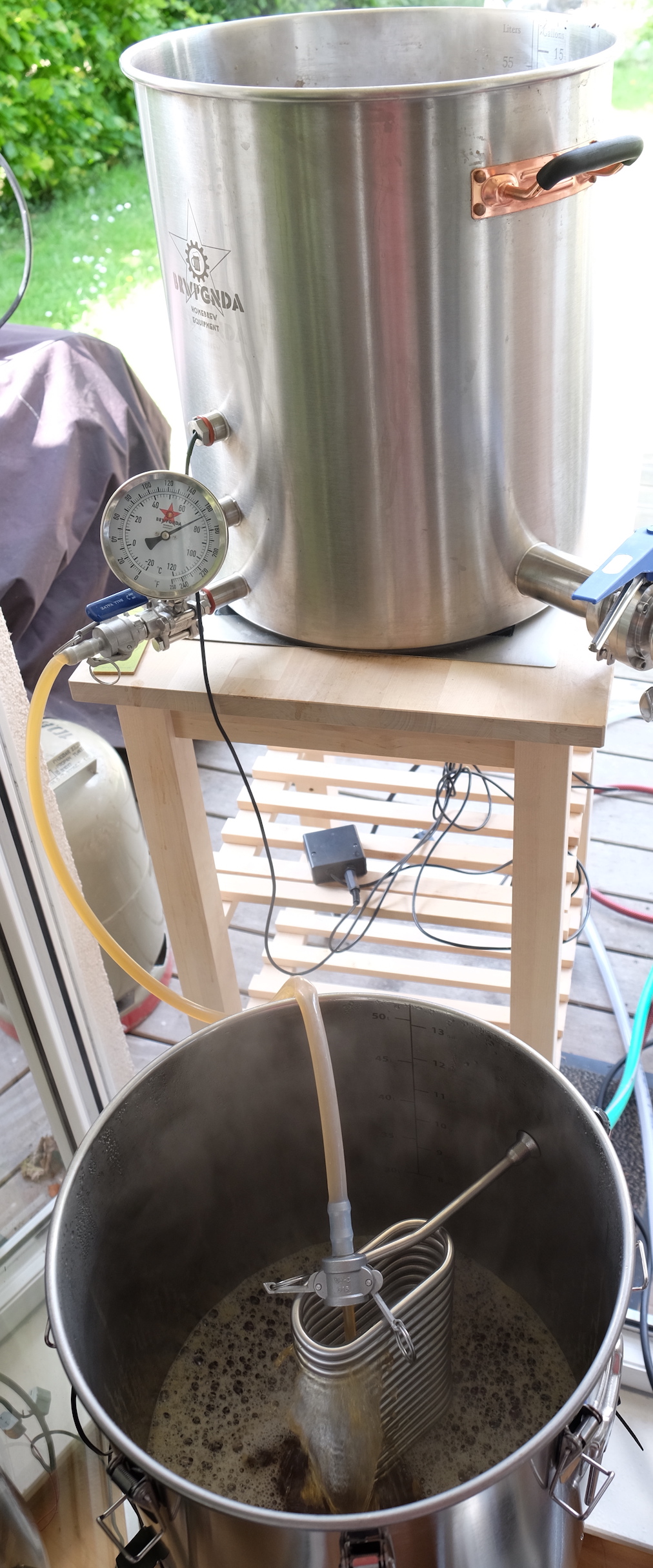 Also als nächstes Malz abwiegen und Schroten: Parallel die Sudpfanne aufbauen und Hauptguss einlassen: Jetzt fällt mir auf, dass ich hier gar kein Bild des Gesamt-Setups gemacht habe. Deswegen schonmal eins "von Später": Der Läuterbottich wurde währenddessen mit heissem Wasser gefüllt und mit der Läuterpumpe mitsamt Schläuchen nochmal durchgespült. Dann habe ich mit Schlupfs Wasserrechner die nötige Milchsäure ausgerechnet, um in der Maische auf einen PH von ca, 5,4 zu kommen. Im reinen HG habe ich nach der Milchsäuregabe schonmal pH 6,4 (statt 9,7 wie normal). Dann kam mein erstes Problem: Ein Temperatursensor hat sich verabschiedet (Der der Sudpfanne). Leider habe ich alle Ersatzsensoren inzwischen irgendwo verbaut... also umgesattelt und statt dem Nachgusstopf mal wieder den Chronical als Nachgusserhitzer zweckentfremdet. Habe ich auch schon häufiger gemacht (Einfach die Heizpatrone von unten reingeschoben) - hat den Vorteil, dass der Chronical auch nochmal sterilisiert wird. Inzwischen sind die Amylasen auch fleißig: Und ich kontrolliere ob die PH-Vorhersage passt. Sieht gut aus! Jetzt habe ich den CBPi seine Arbeit verrichten lassen und mich an das zweite Projekt gesetzt - die Steuerung für die Heizung des Chronicals, da die Voss Hefe es ja gerne muckelig warm hat. Also Tablet mit CBPi Oberfläche mitgenommen und mich dran gesetzt. Im Hintergrund sieht man übrigens den Prototyp des anderen laufenden Projekts: Der zweileitige automatische GDA frei nach diapolo / JollyJumper. Aber dazu später mehr: Die Hopfenparade des Tages (v.L.n.R, bei der 15° Gabe ist etwas Irish Moss mit drin): Dann den Läutertopf vorbereitet und abläutern, dann Läuterruhe: Läutern in die Sudpfanne, gleichzeitig aufheizen und Nachguss geben: Abschließend habe ich in den Läuterbottich (Nach grobem Spülen) mit Heisswasser und Geschirrspülpulver zusammen mit Pumpe und Schläuche schonmal spülen lassen. Hopfenkochen ca. 10-15° vor Ende die Kühlschlange und das Whirlpoolpaddel mitgekocht: Anschließend Würze Ausschlagen: Whirlpool-Kegel: Endgültige Stammwürze (Ist etwas weniger geworden, da die Menge etwas mehr geworden ist (Habe zu lange geläutert): Danach wurde im Chronical mit Wasser auf 40° abgekühlt, der Gärbottich an die Heizungssteuerung angeschlossen. Um 16:00, also Punkt 8 Stunden nach Beginn, wurde die Hefe zugegeben. Außerdem war jetzt alles wieder sauber. Für die, die es interessert, hier noch die Diagramme.
