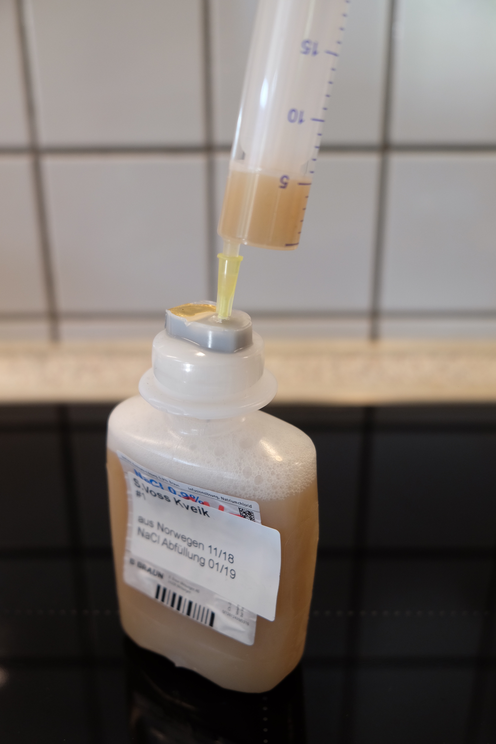 Da ich seit einiger Zeit die Sigmund Voss Kveik hier habe, wollte ich sie endlich mal einsetzen. Also habe ich - ohne genau zu wissen, welches Bier es wird, die Hefe am Donnerstag schonmal aufgeweckt. Am Freitag nach der Arbeit war die Hefe dann schon durch mit dem Starter, also habe ich die nächste Stufe propagiert. Die zweite Stufe war, wie man sehen kann, ca. 1,3 Liter. Ich habe dann auch nicht weiter propagiert, da laut Lars Marius Garshol die Hefe, um ihre besonderen Aromen rauszubringen, deutlich underpitched werden soll (Er spricht von 1 TL Slurry auf 25 Liter). Ich stelle 40L Ausschlagwürze an, dafür sollte gut 1L Starter dann mehr als ausreichend sein.