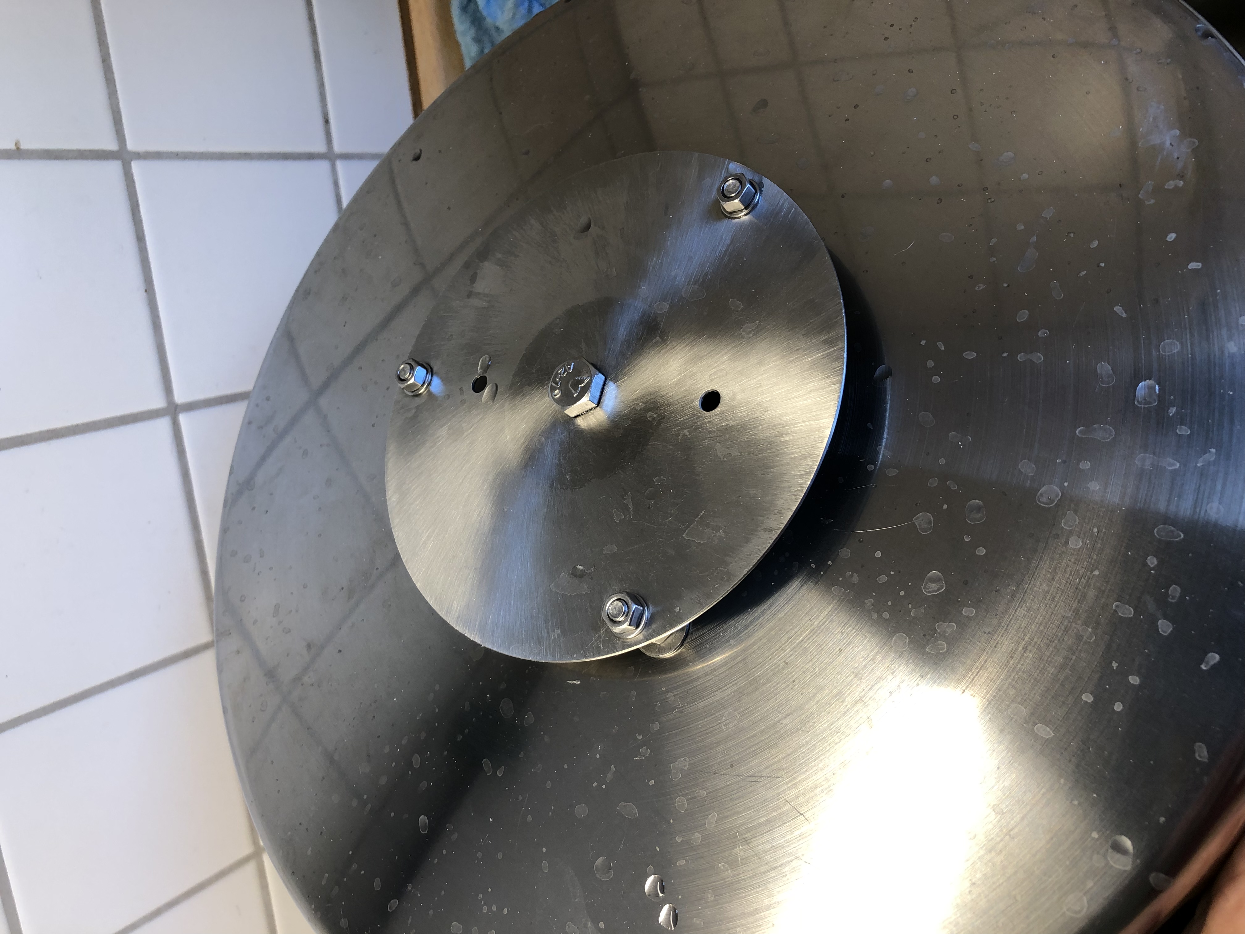 Falls sich jemand wundert: Der M8 Bolzen der bei mir mittig in der Prallplatte sitzt hat keine tiefere Bedeutung. Der is da nur um ein Loch in der Prallplatte zu verschließen welches da vorhanden war. (Weil die Platte wie gesagt recyclet war und ursprünglich Teil einer Terassenlampe war..)