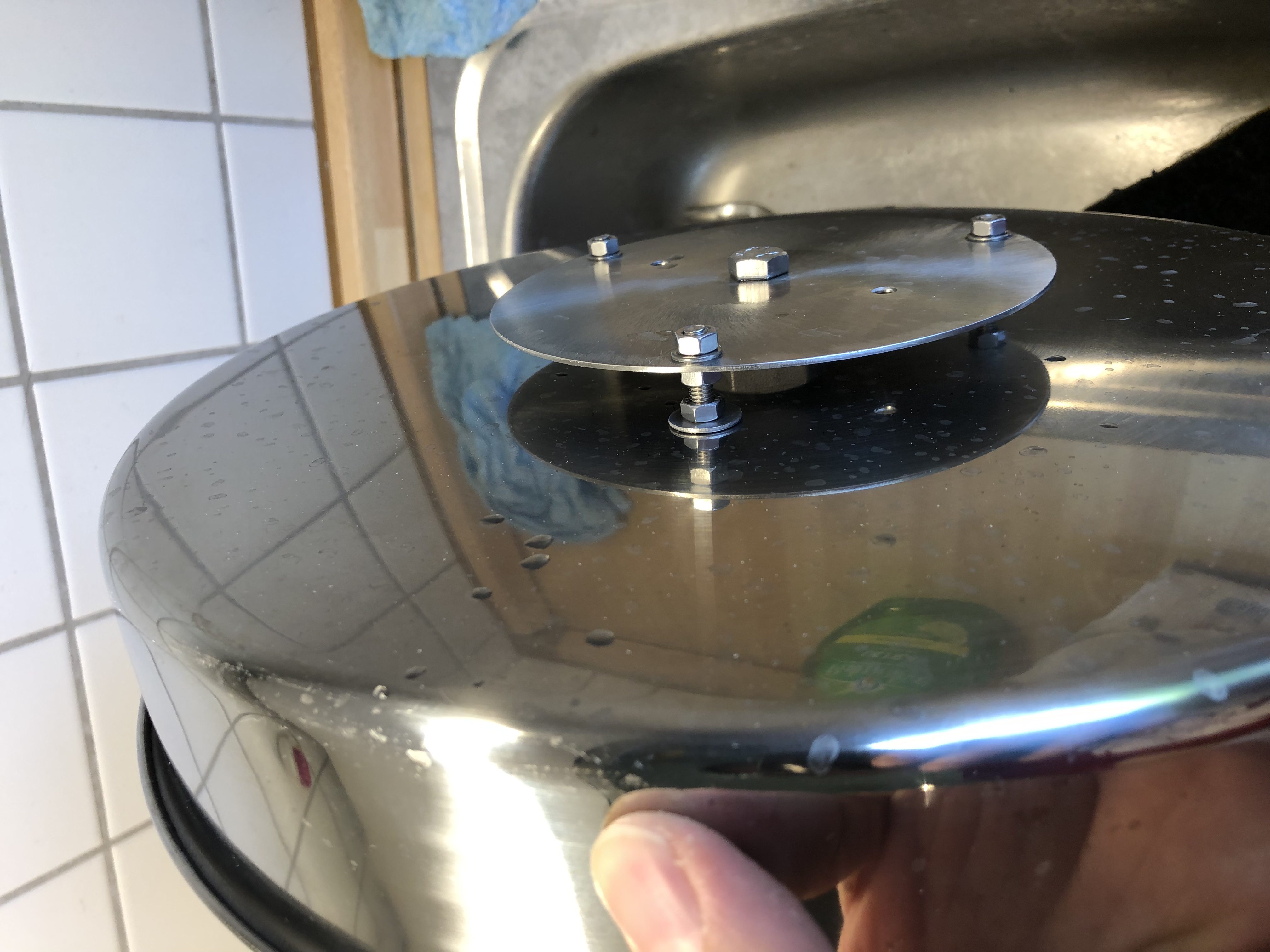 für mich sieht es aus wie ein Deckel+Tülle der in einer Edelstahlform liegt. Darunter hast du eine kleine Prellplatte (Bild 3) mit Muttern angebracht.