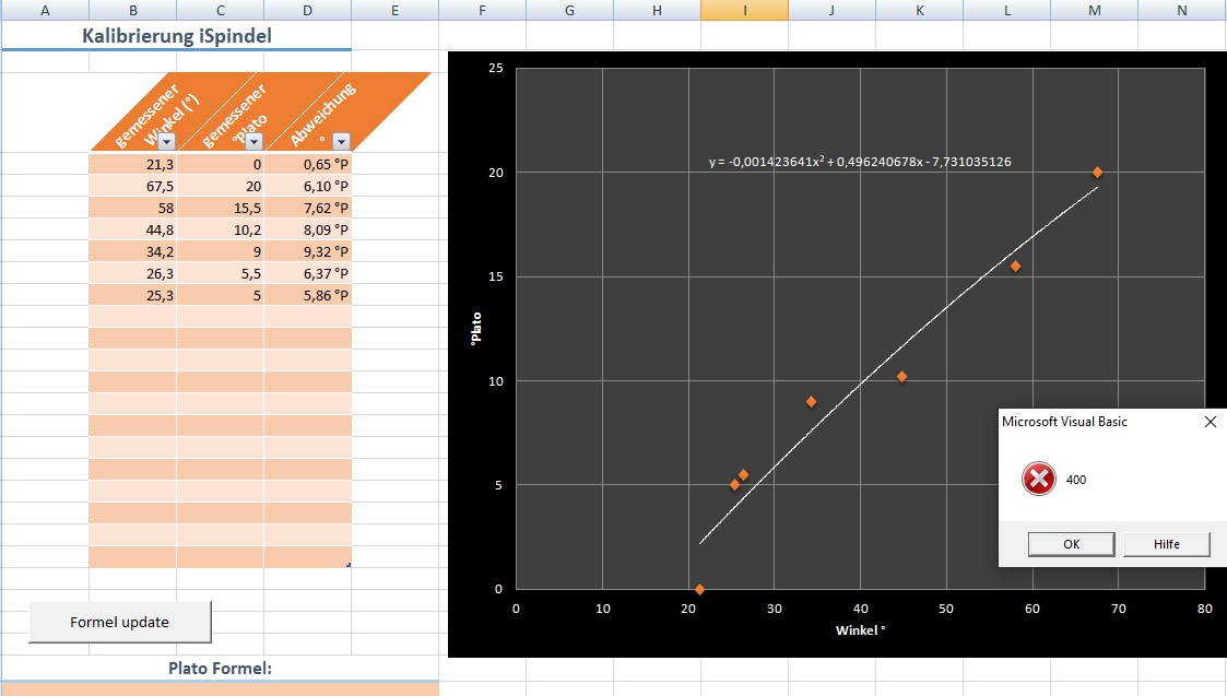 Hab dann die Kalibrierungs-Prozedur durchgeführt und die Werte in das Excel eingetragen. Un dann, ich traue mich gar nicht es zu schreiben, bekam ich beim Drücken der Formel-Update Taste den Fehler 400 von Micsosoft Visual Basic