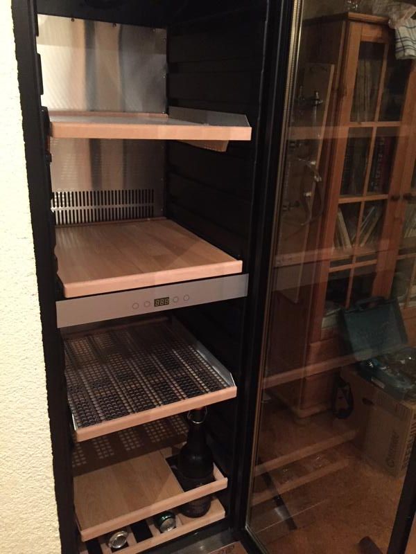 Das Gerät sieht äußerlich sehr wertig aus, hatte aber im Innenraum einige mysteriöse Spuren, die ich nicht zuordnen konnte. Da der Schrank aber ohnehin hoffentlich immer gefüllt sein wird, sah ich darüber hinweg und konnte schließlich planen und Maß nehmen. Die für die liegende Weinlagerung gedachten Regalböden haben ein viel zu breites Raster für aufrecht stehende Bierflaschen. Ich brauche also mehr "Stellfläche". Die