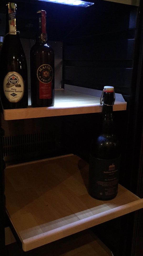 Böden sind in unterschiedlichen Höhen auf stabilen, kugelgelagerten Schubladenauszügen montiert. Vom Werk sind diese Höhen teilweise selbst für 0,33er Flaschen zu klein, von 0,5 oder gar 0,75l ganz zu schweigen.