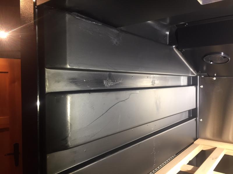 Nun noch das Problem der mangelhaften Stellfläche auf den ansonsten sehr wertigen Liegerosten. Ich begann, einfach die Böden vollflächig mit leichten Laminatresten zu belegen. Das ging schnell und sah gut aus. Vor der Inbetriebnahme wurde mir aber klar, dass ich durch diese massiven Zwischenböden jegliche Luftzirkulation unterbrechen werde.