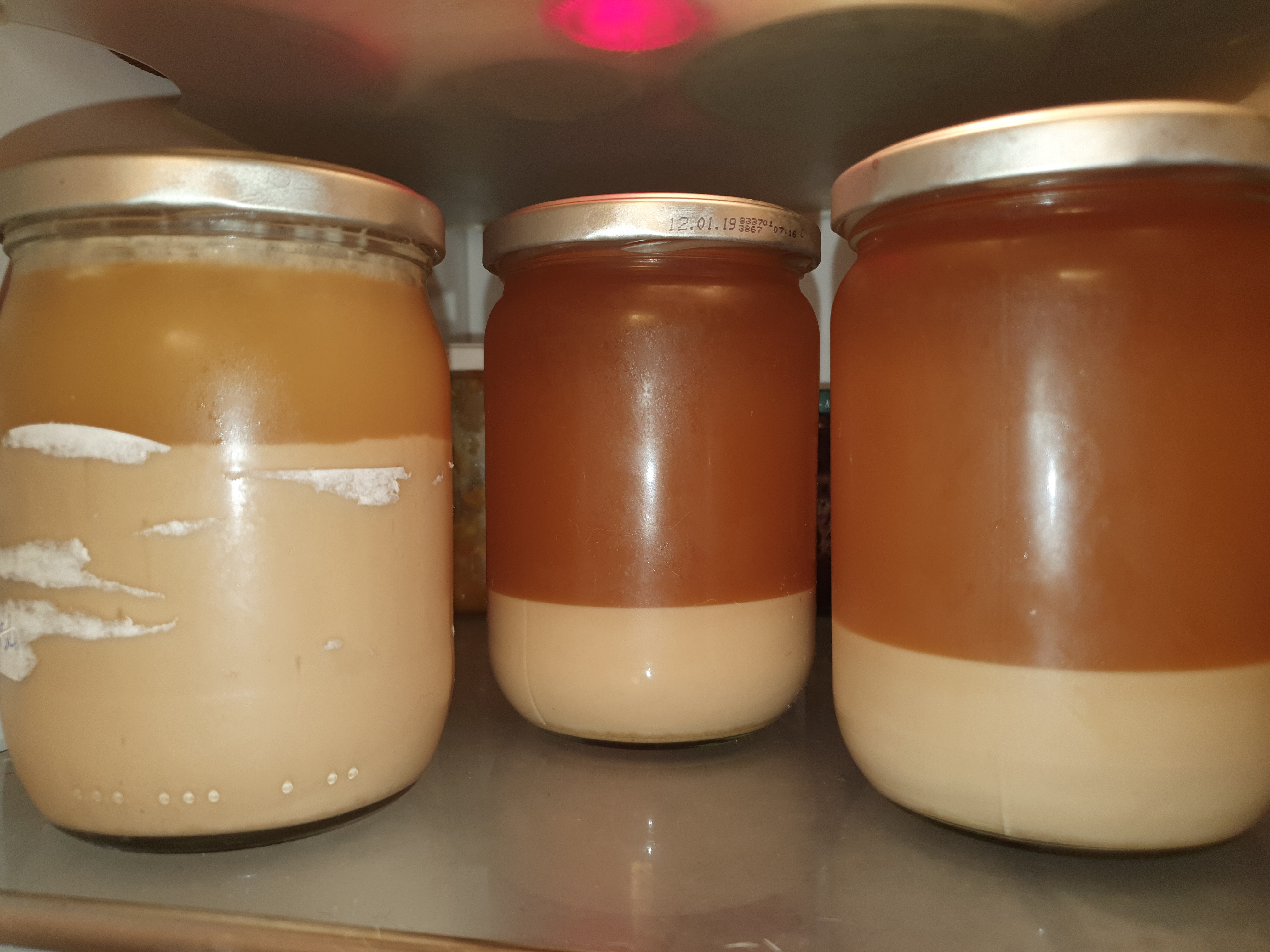 Einen Frage dazu, sollte ich nun die obere Flüssigkeit, in der meinem Verständnis nach ja die Hefe ist, in einem neuen Glas zusammenführen und abschöpfen oder würdet ihr die drei Gläser einfach für sich im Kühlschrank belassen??