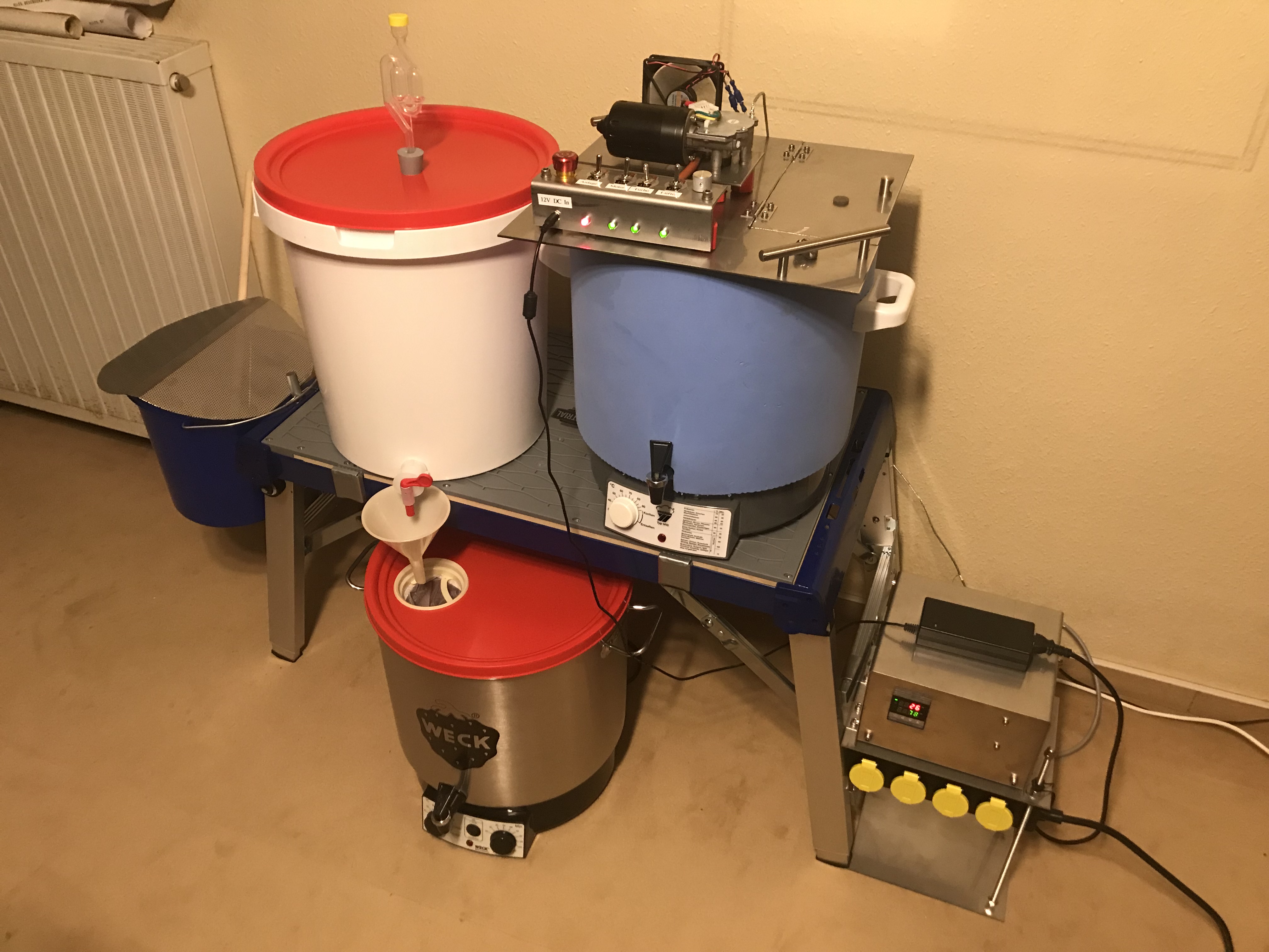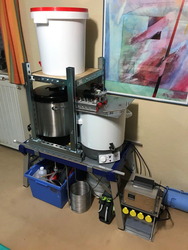 Die Montageprofile sind aus dem Baumarkt, die Platte auf der der Läuterbottich steht, ist der Rest einer Küchenarbeitsplatte, die ungenutzt in der Garage rumstand.