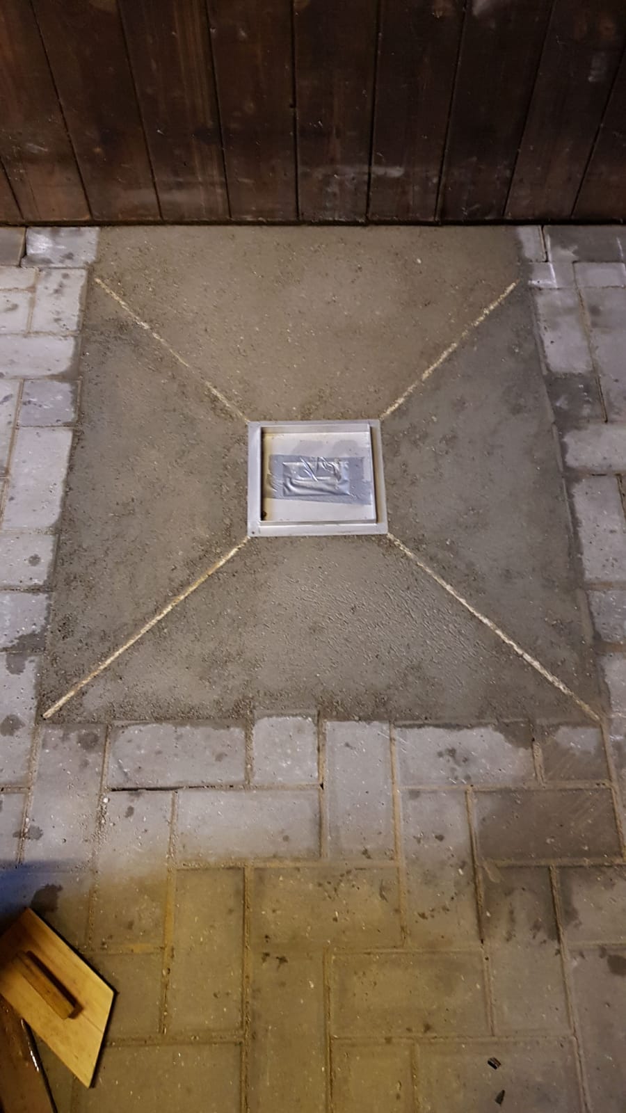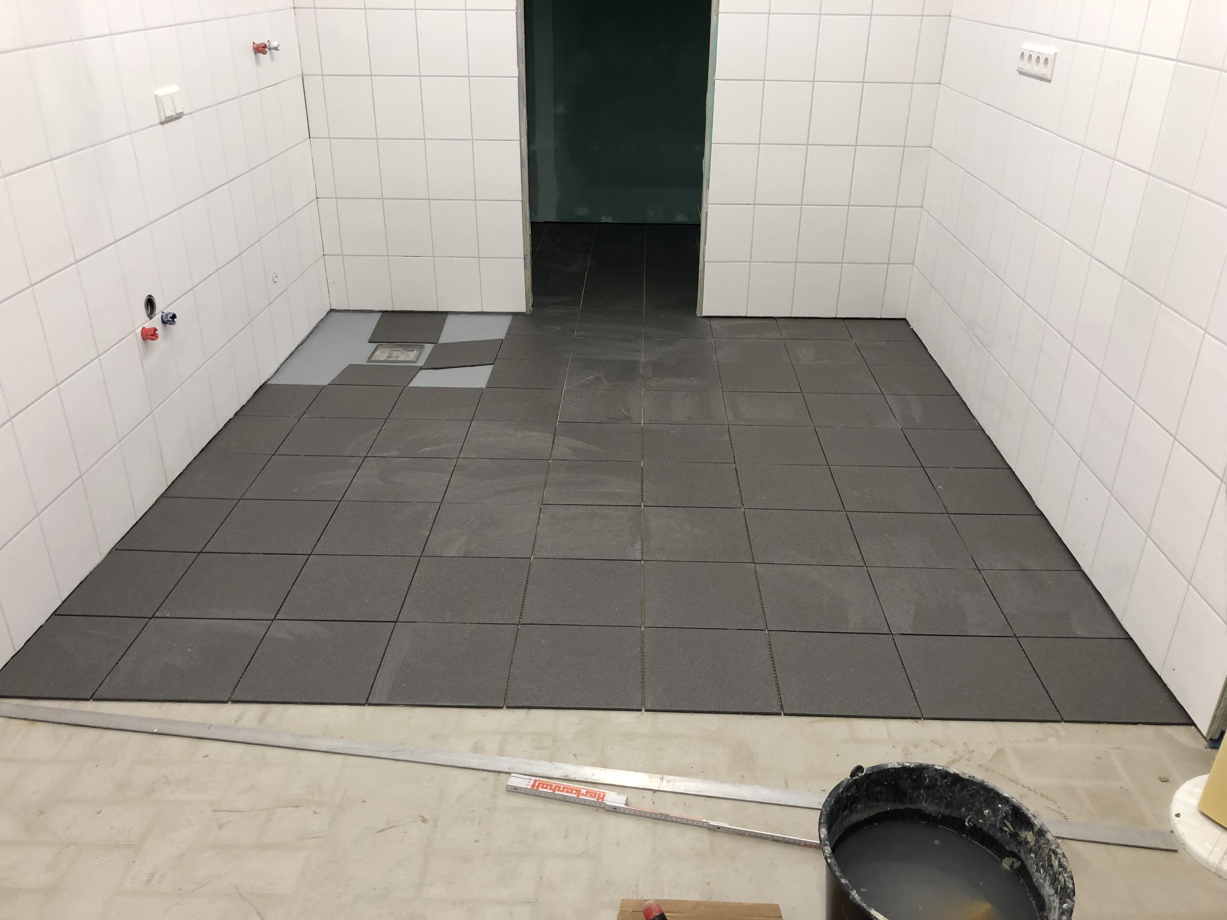Heute wurden die letzten Bodenfliesen gelegt, der Bodenablauf ist jetzt auch gefliest.
