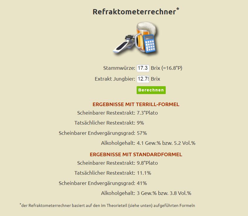 Ich habe das jetzt selbst mal gemacht. Wie ich mir schon gedacht hatte, benutzt der KBH wohl die Standardformel bei Berücksichtigung von Refraktometerwerten.