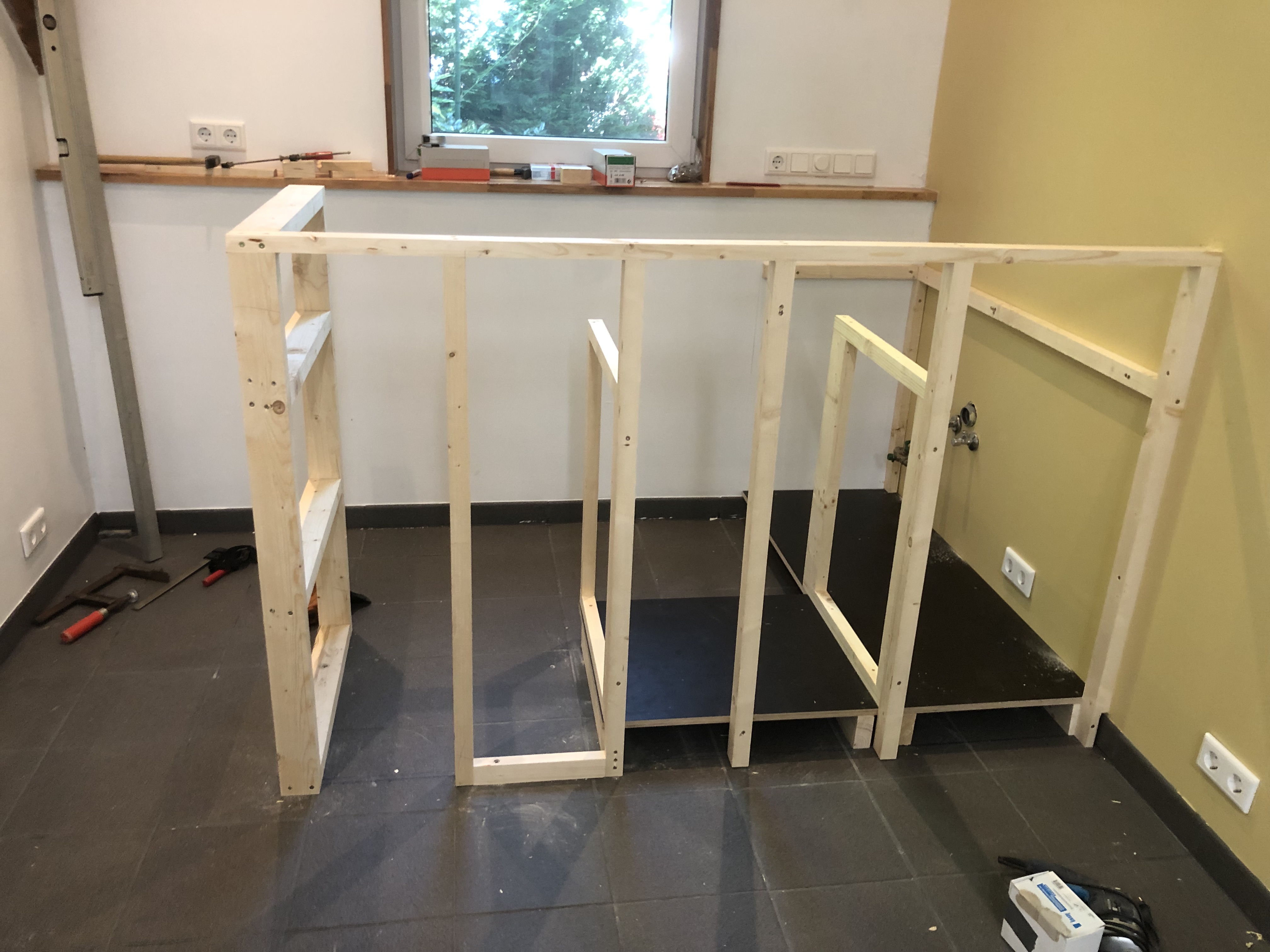 Ich habe mittlerweile angefangen, den Aufenthaltsraum weiter zu bauen. Die Theke nimmt Gestalt an.