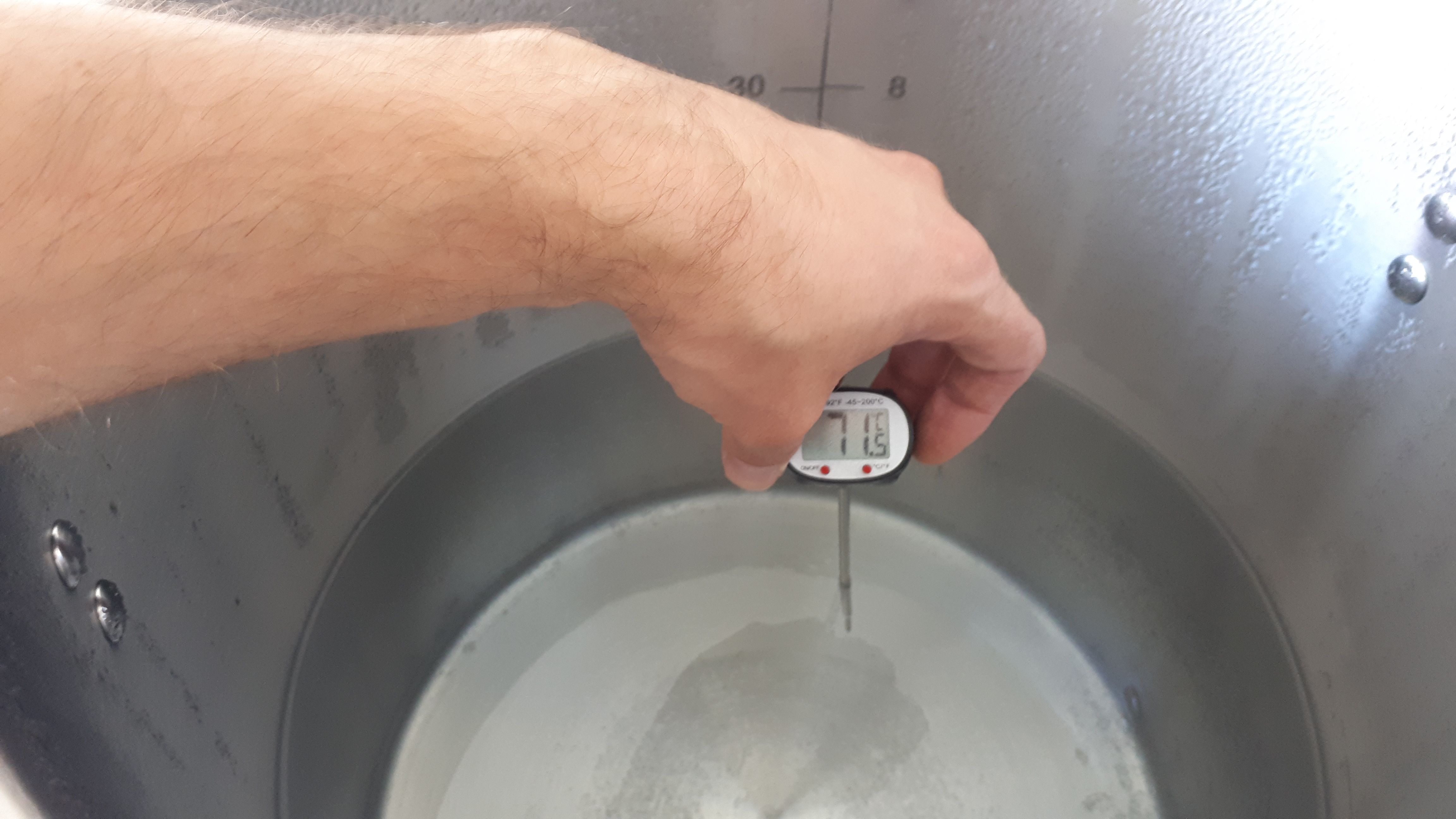 Der Kessel wird mit 18 Liter Wasser befüllt und auf 71° C hochgeheizt. Zur Sicherheit habe ich noch mal einen Abgleich zwischen CraftBeerPi und Eintauchthermometer gemacht - sieht gut aut (die Temperatursteuerung erfolgt bei mir aktuell manuell). Die Abweichung war so gering, dass ich den Test nur noch mal zwischendurch durchgeführt habe und dann das Thermometer beiseite gelegt habe.