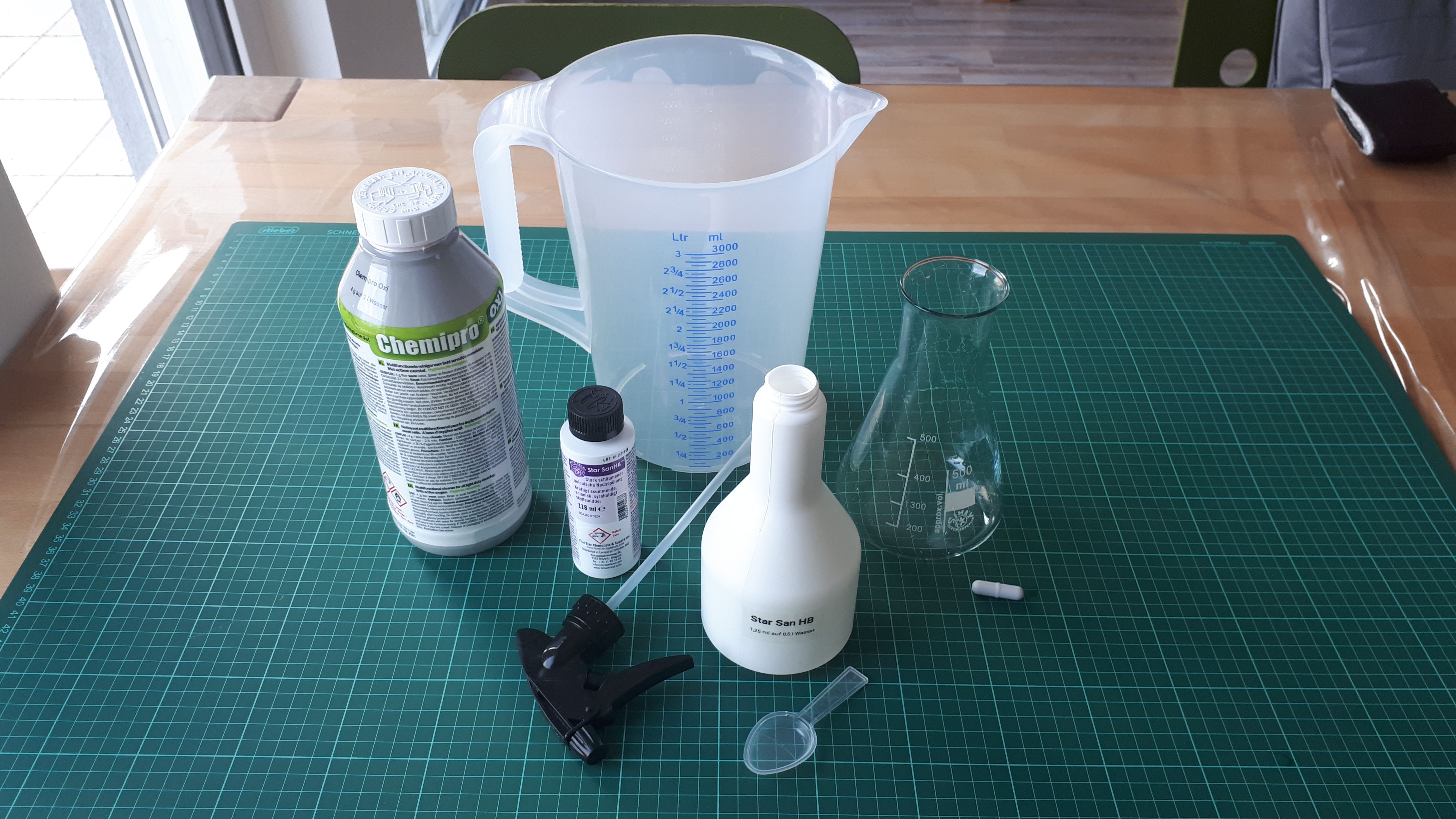 Am Vorabend wird das Gärfass nebst Zubehör mit Chemipro Oxi gereinigt und der Hefestarter angesetzt.
