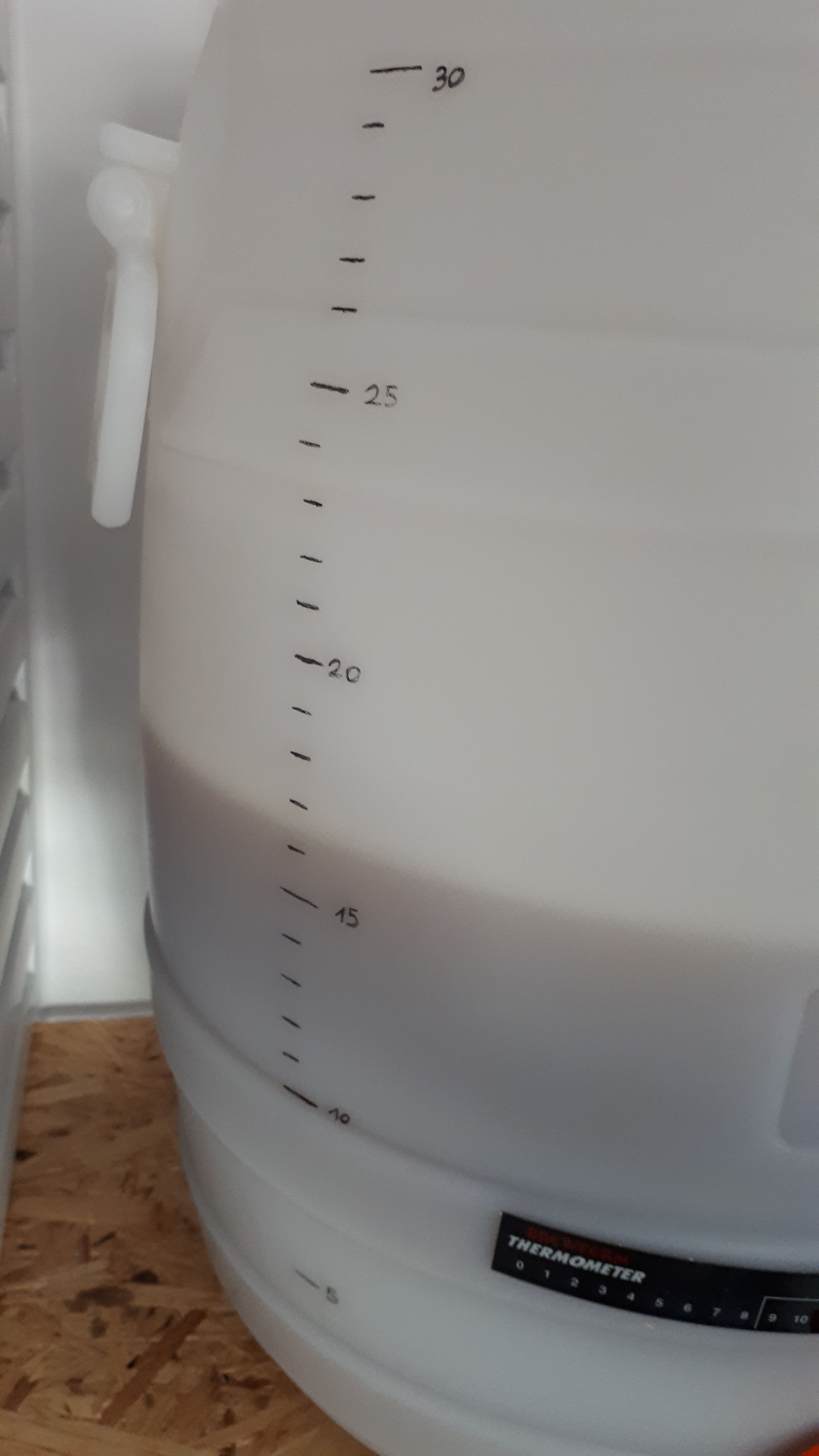 Am Ende des Brau-Tages (also gegen 16:40 Uhr) waren 16,5 Liter Würze im Gär-Kühlschrank (Ziel waren 20 Liter lt. Anleitung). Die Hefe wurde zugegeben, damit die Party starten kann.