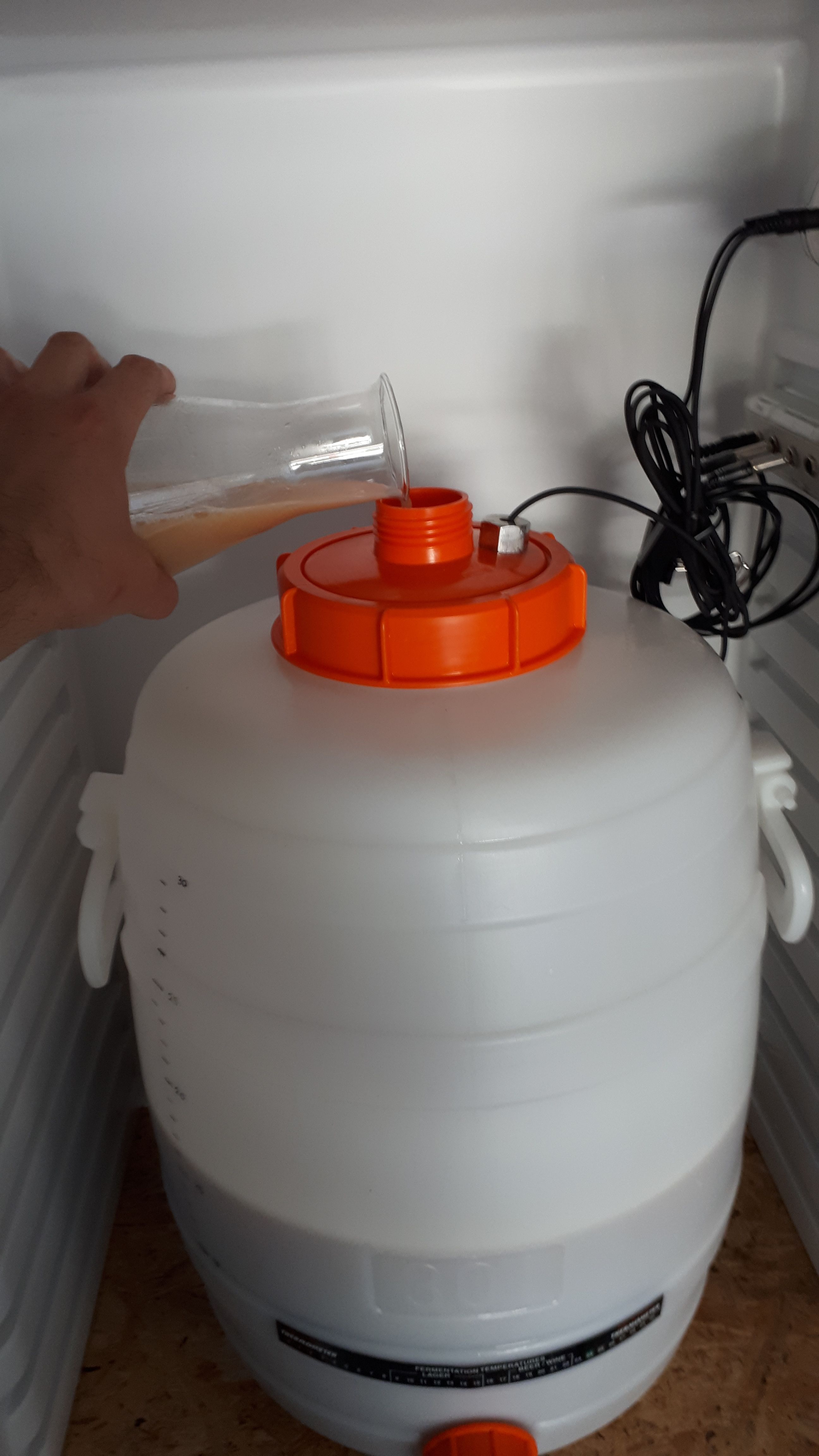 Am Ende des Brau-Tages (also gegen 16:40 Uhr) waren 16,5 Liter Würze im Gär-Kühlschrank (Ziel waren 20 Liter lt. Anleitung). Die Hefe wurde zugegeben, damit die Party starten kann.