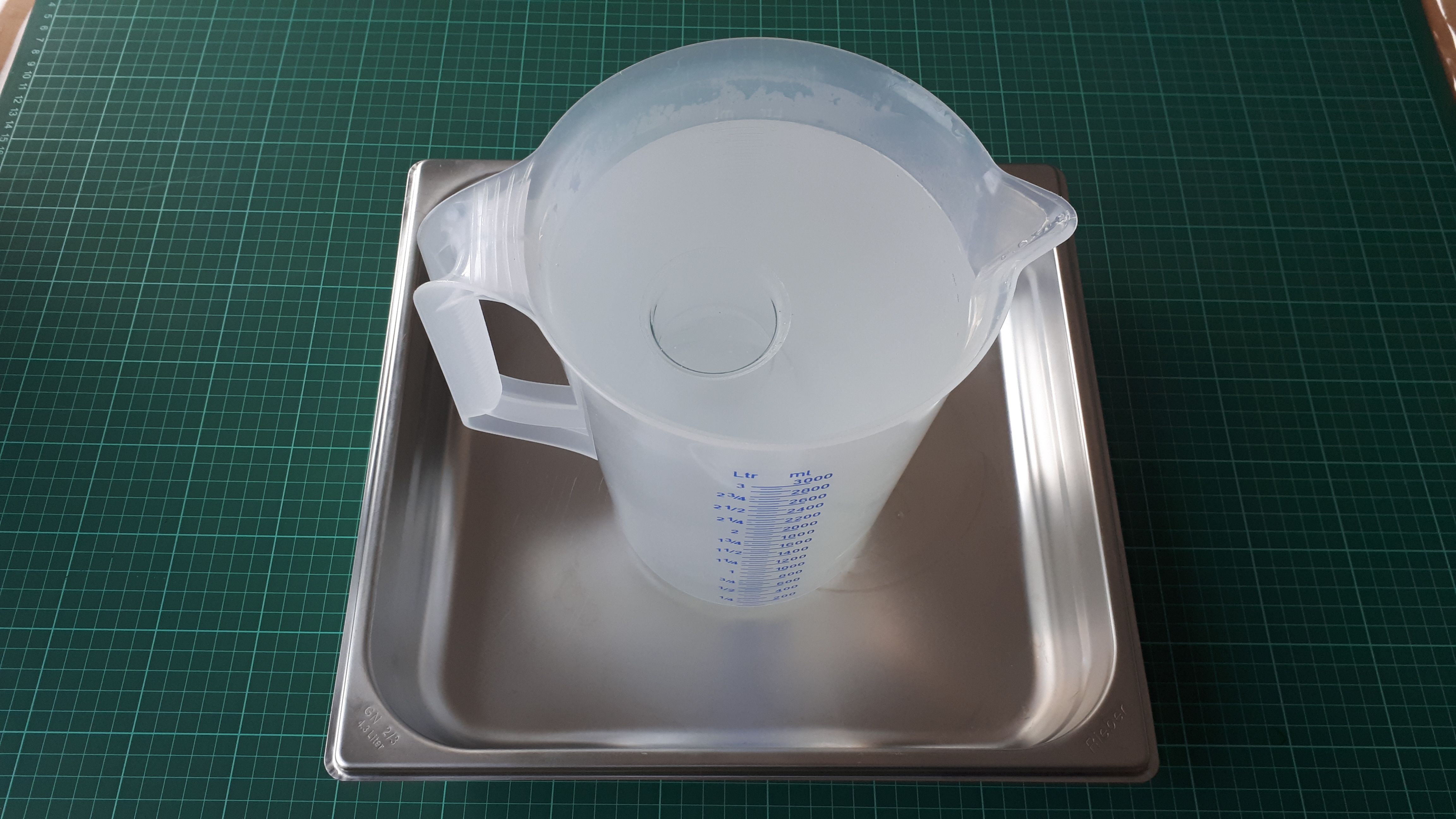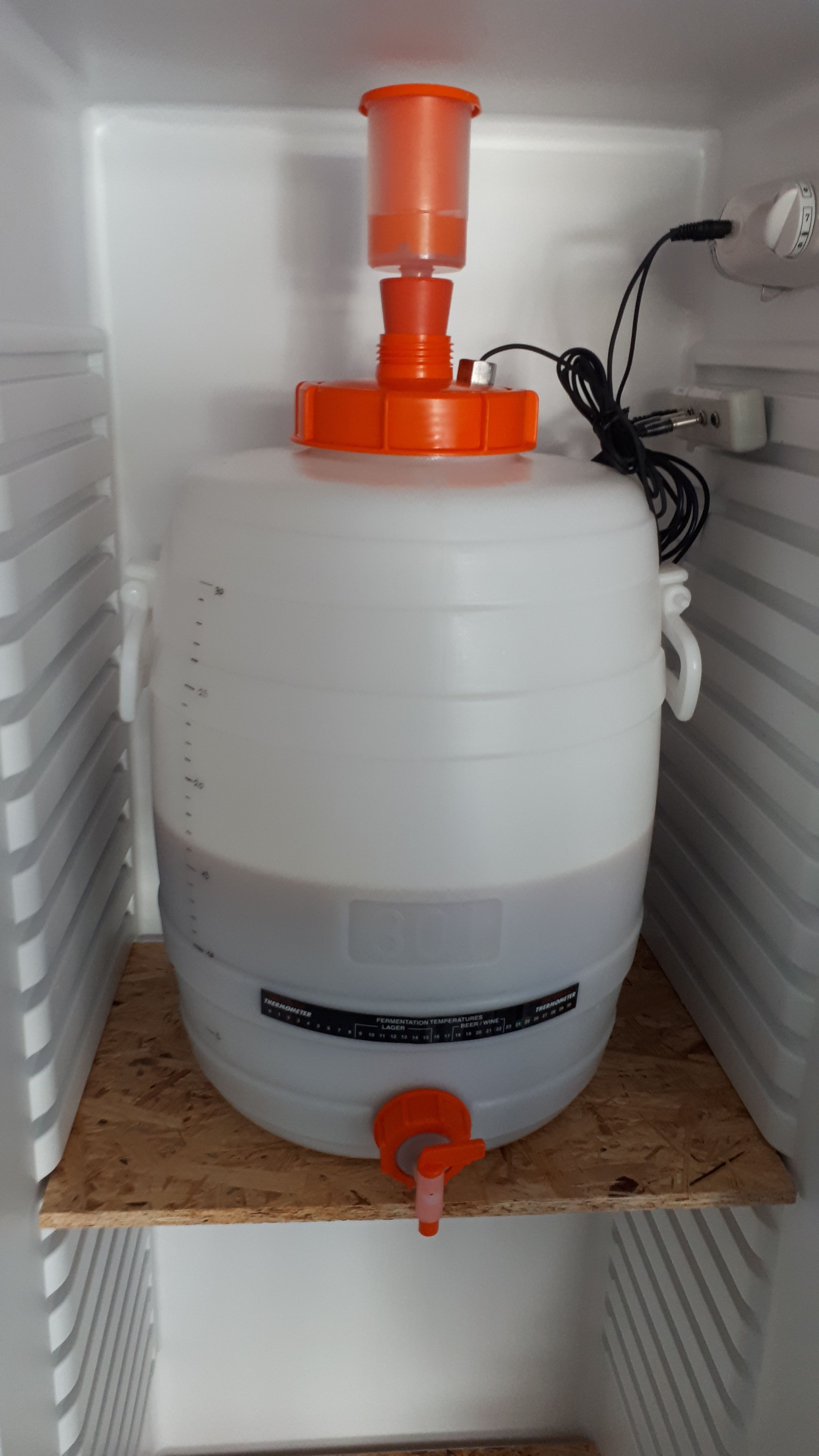 Am Ende des Brau-Tages (also gegen 16:40 Uhr) waren 16,5 Liter Würze im Gär-Kühlschrank (Ziel waren 20 Liter lt. Anleitung). Die Hefe wurde zugegeben, damit die Party starten kann.