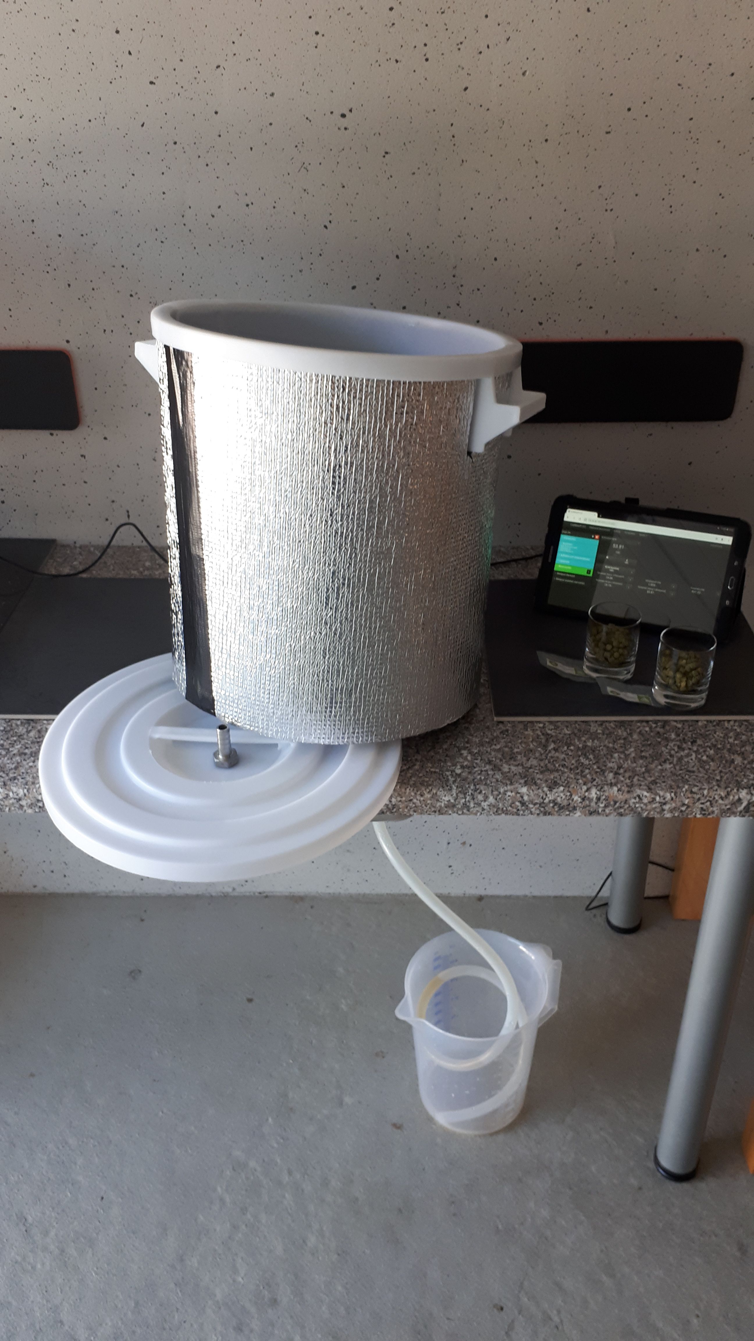 10 Minuten vor Kochende habe ich die Kühlspirale "mitgekocht" und anschließend alles auf Anstelltemperatur heruntergekühlt (was ca. 50 Minuten gedauert hat). Kam mir irgendwie recht lange vor. Gekühlt wurde mit Wasser aus der Zisterne, welches am Ende auch wieder in der Zisterne landete.