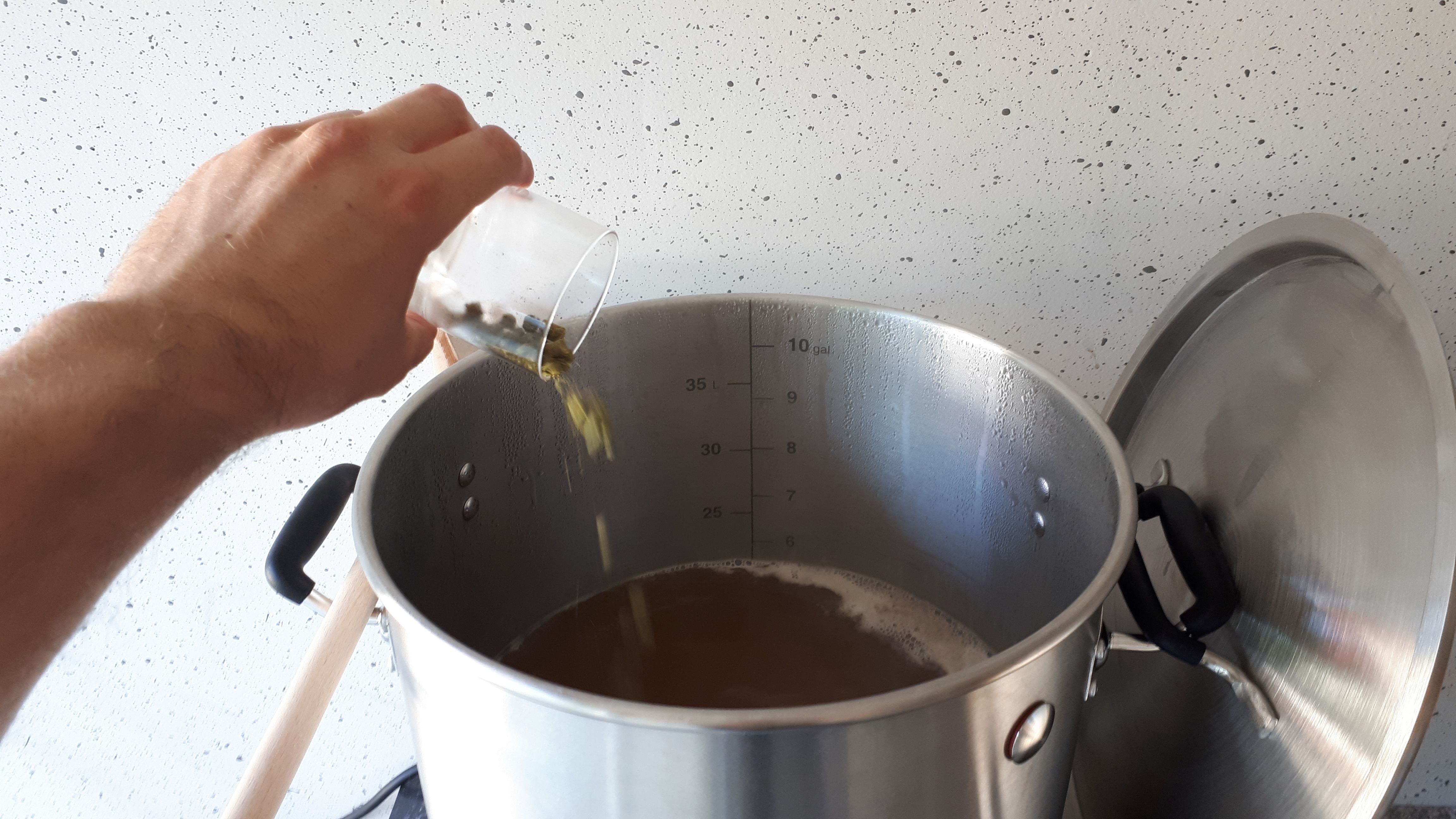 Das 70 minütige Würzekochen beginnt. Erste Hopfenbgabe bei 40 Minuten, zweite Hopfengabe 1 Minute vor Kochende.