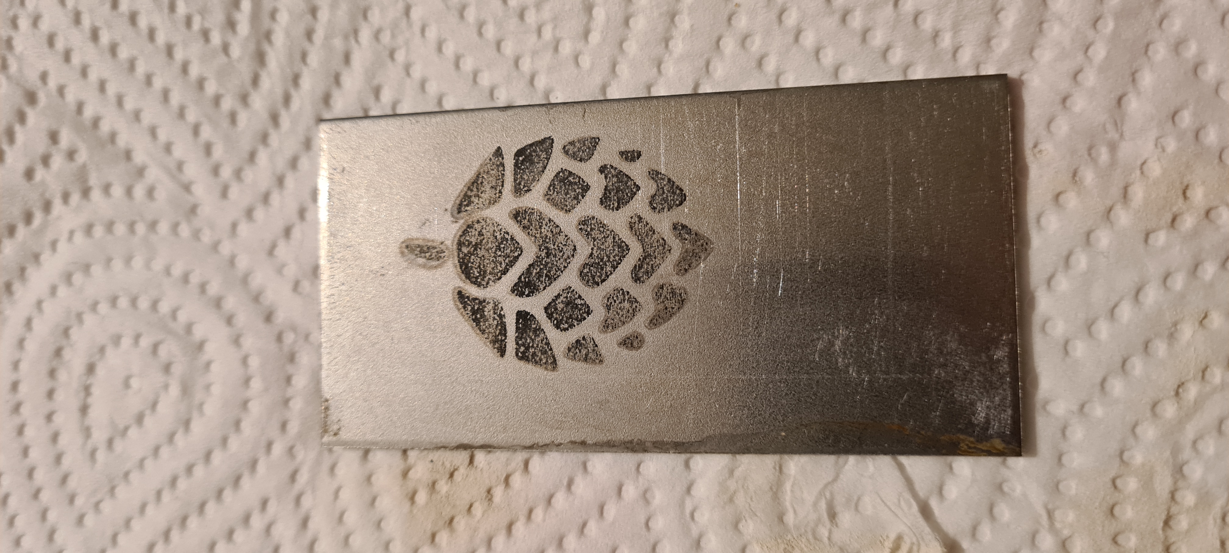 Für den ersten Versuch musste ein kleines VA Blech herhalten; mit 400er Papier grob poliert, mit Silikonschaber 1 Millimeter Senf aufgetragen und los gehts. Danach wiederSenf drauf und das gleiche Spiel nochmal. Abwaschen und das Ergebnis kann sich durchaus sehen lassen :thumbsup