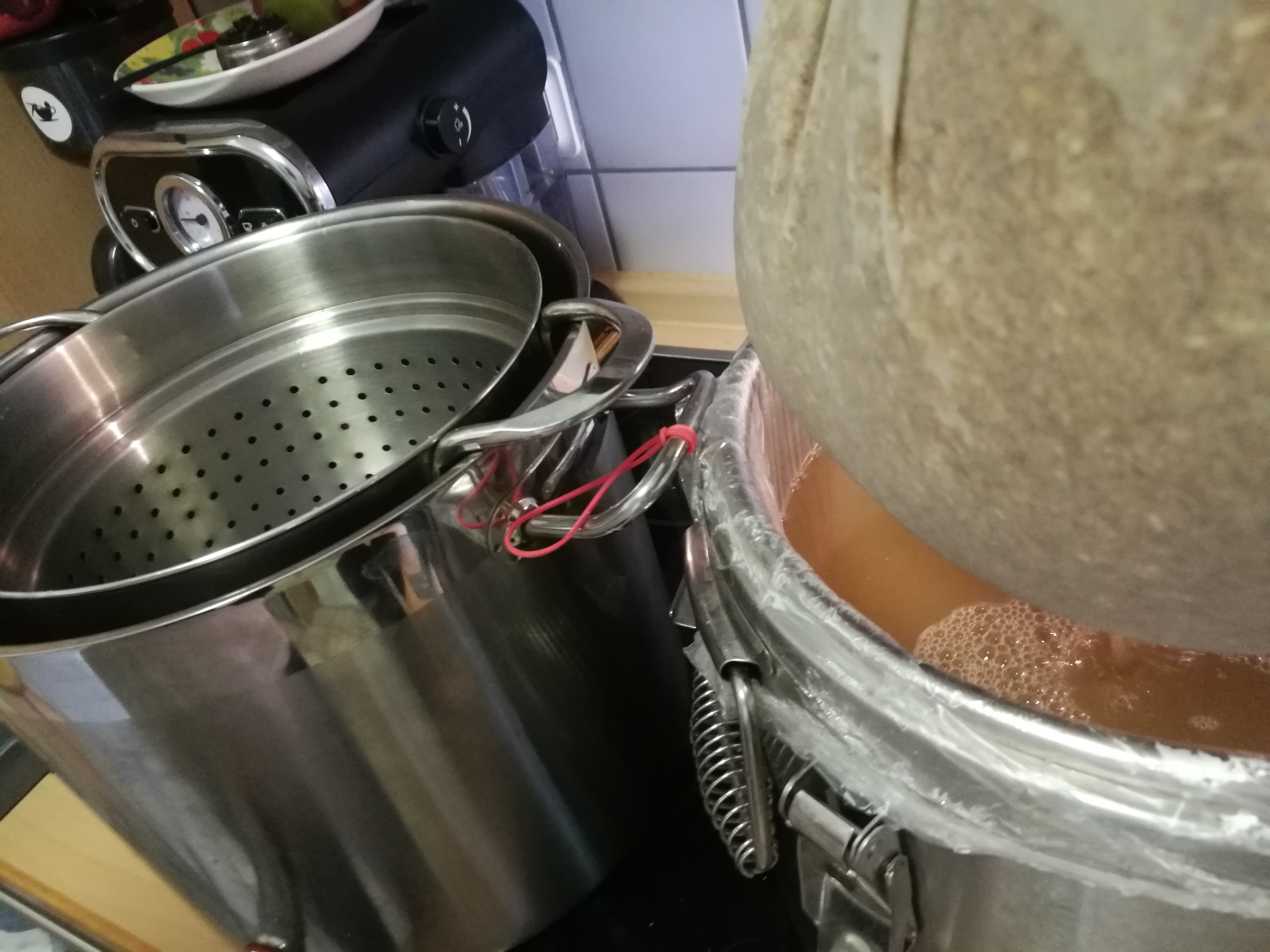 Abmaischen bei 62°C in einem Nudelsieb, alles sehr unproblematisch. Die Treber wurden ordentlich gepresst um die Würze zu extrahieren, da kein Nachguss benutzt wurde.