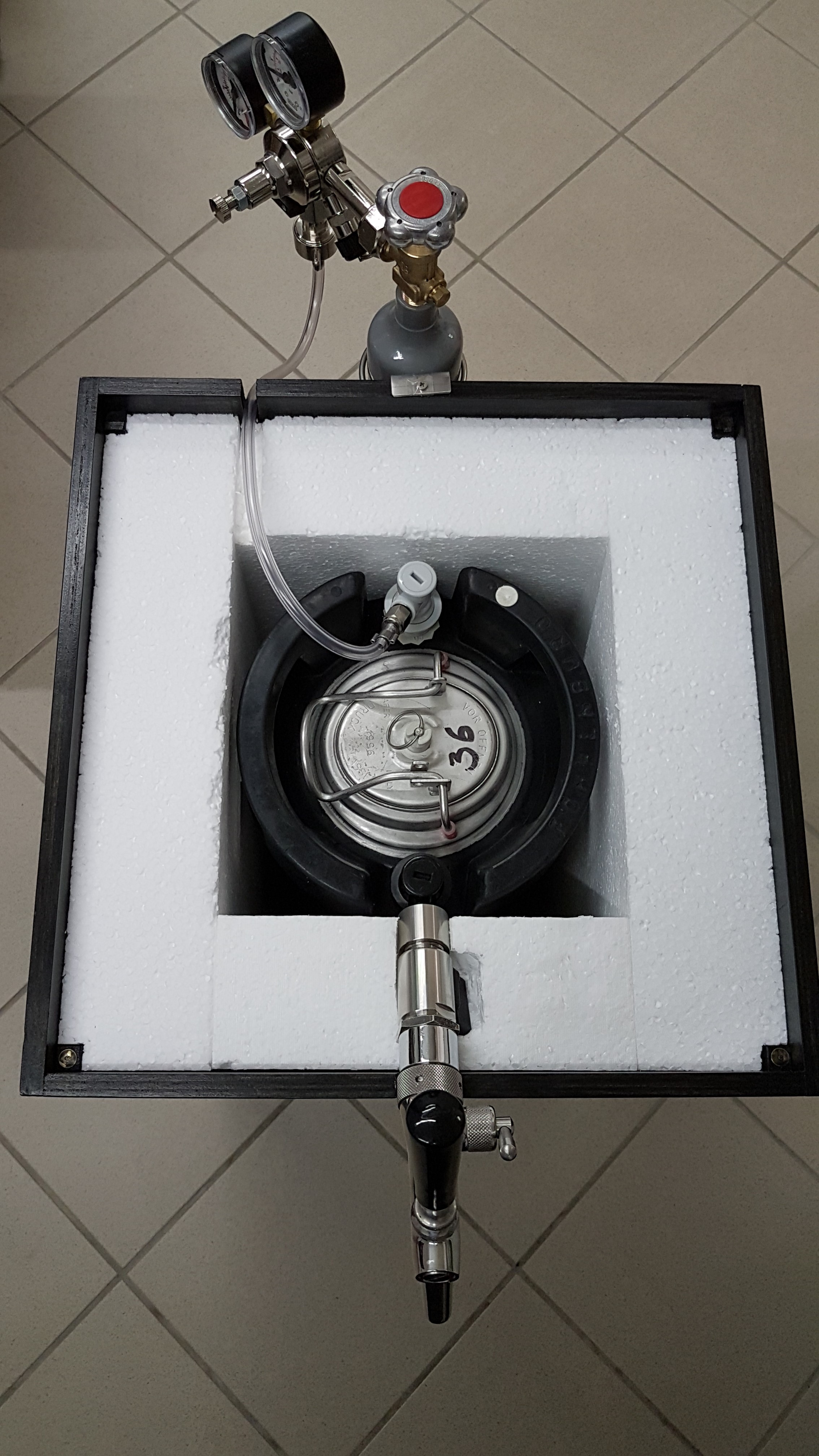 19er NC, 30l Maischetonne etwa ein Drittel mit Eis gefüllt, Direktzapfer, 2 kg CO2 Buddel an der Maischetonne festgemacht. Mehr braucht es nicht.