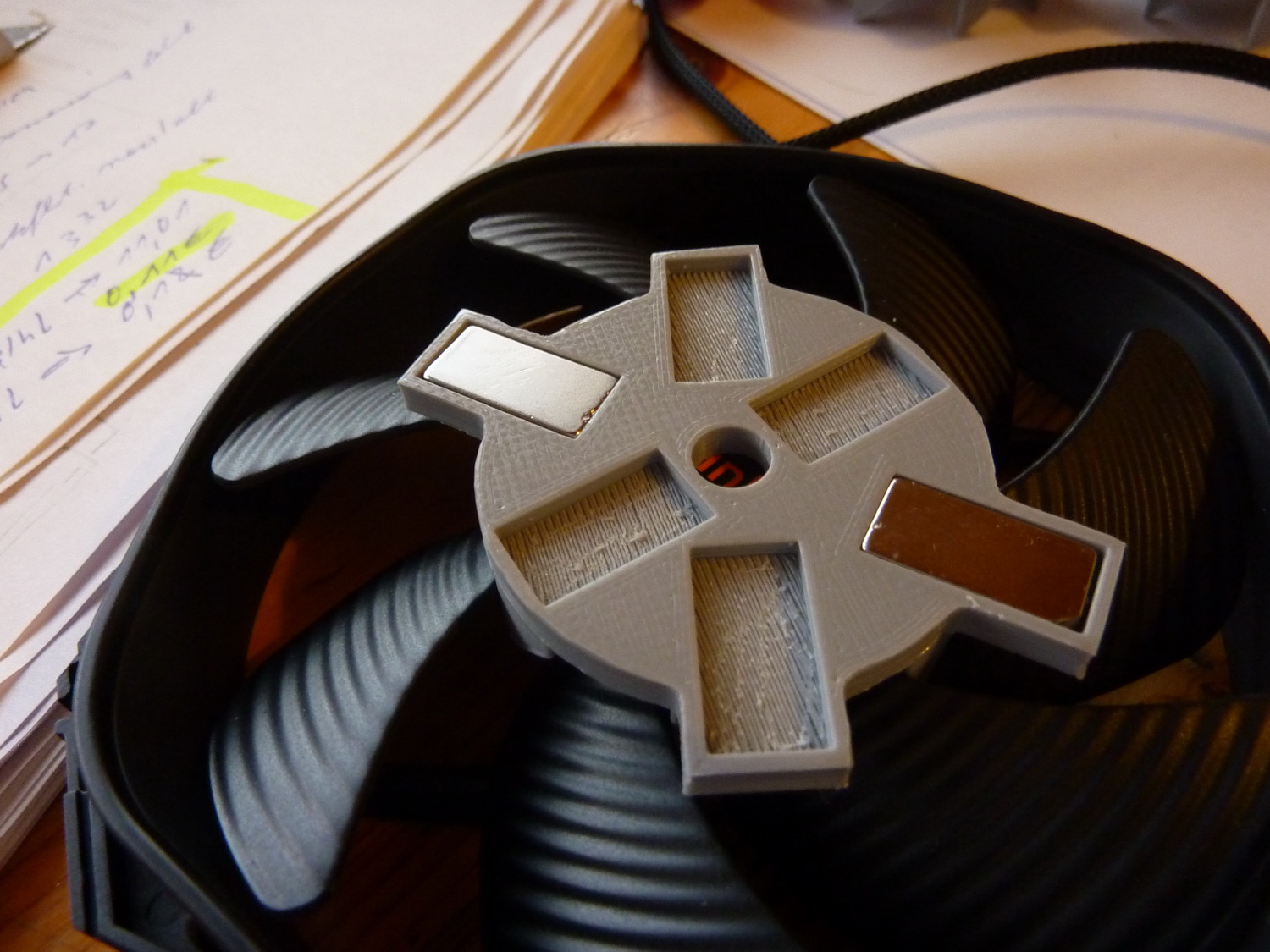 Weniger, bzw kleinere, aber stärkere Magnete haben Vorteile. Je mehr Gewicht auf der Motorwelle liegt, desto geringer ist die Maximaldrehzahl. Mit zwei 20x10x5 mm Magneten schaffen meine Lüfter nur noch 1650 U/min. Ausgetauscht in 20x10x1 mm N52 sind es 200 U/min mehr.