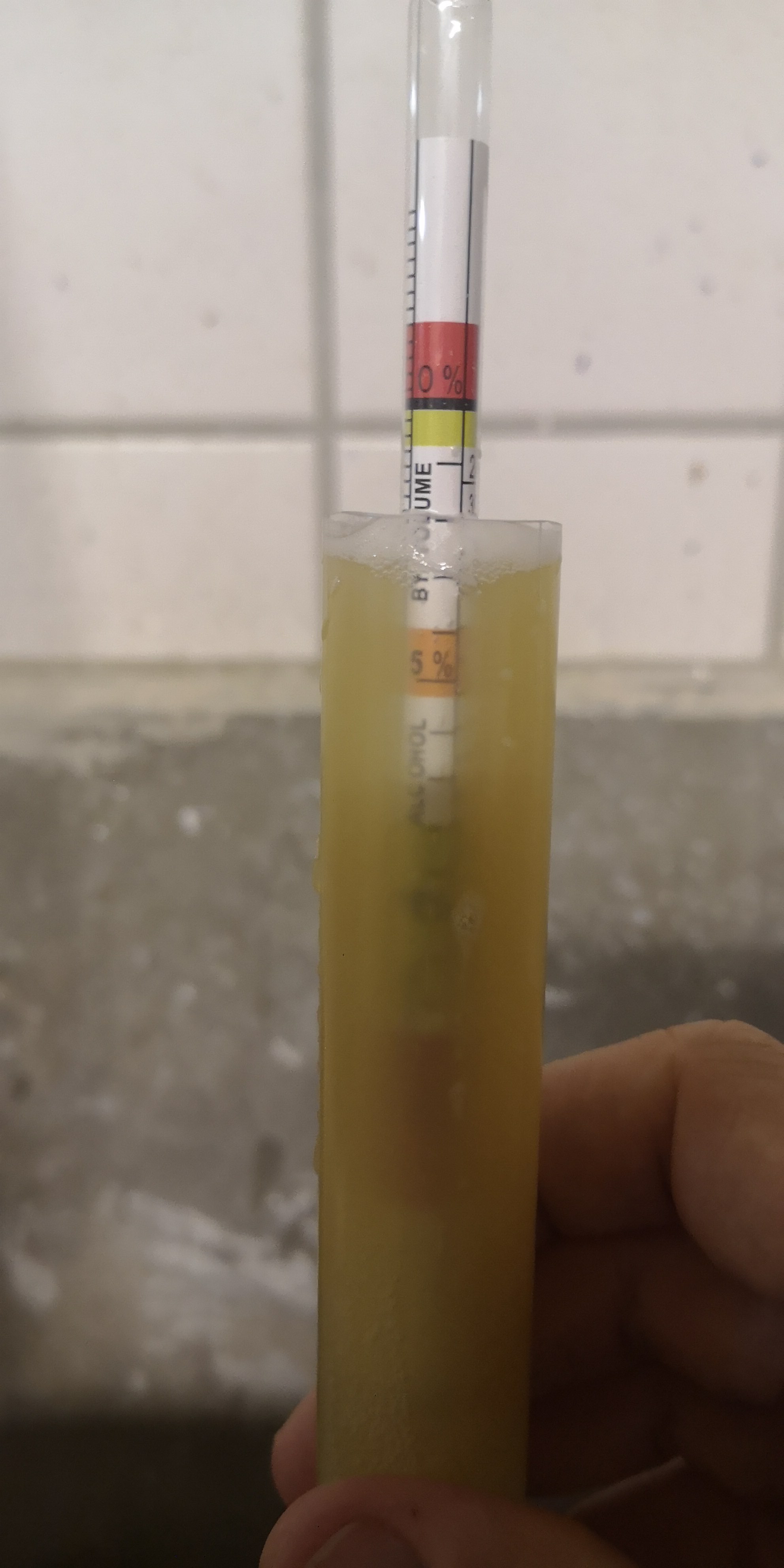 Habe jetz die Hefe 2 Tage arbeiten lassen und die erste Messung gemacht. Aktuell stehts bei 3% Alkohol, und es sieht schon auch fast aus wie Bier. Gärung geht noch langsam voran.