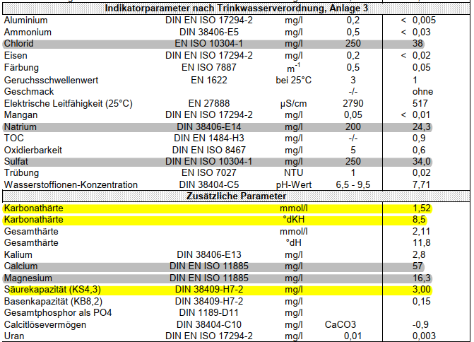 ich werde am WE meinen ersten Sud mit Maischen brauen (bisher lediglich mit Extrakt gebraut). In diesem Zusammenhang hatte ich überlegt was ich mit meinem Wasser anstellen soll. Hierzu gibt's ja ein paar gute Tools im Netz, aber um hier die richtigen Infos zu bekommen, muss man erstmal verstehen was man denn eingeben muss. Vom Wasserversorger habe ich den folgenden Auszug aus der Wasseranalyse erhalten: